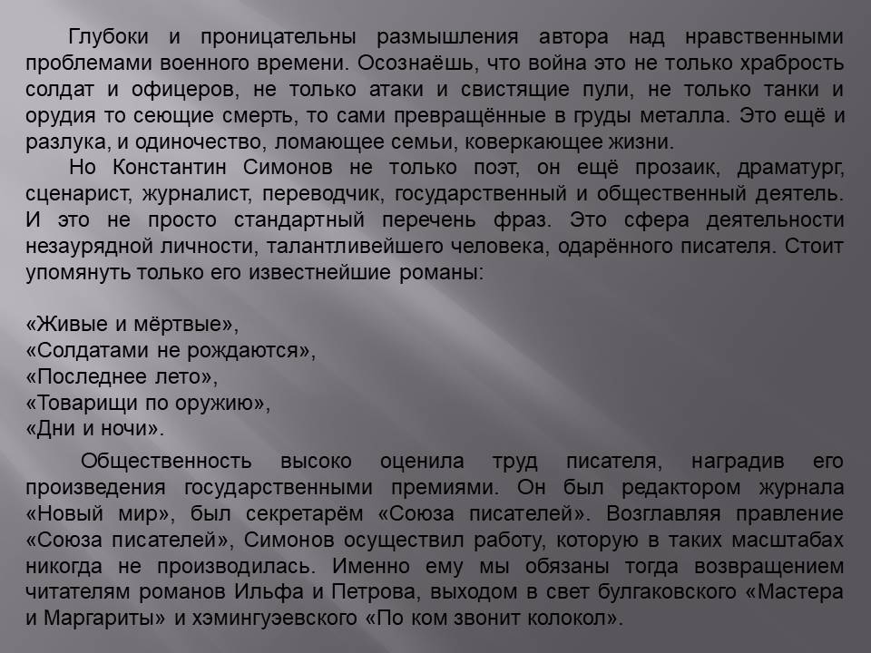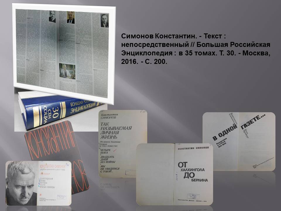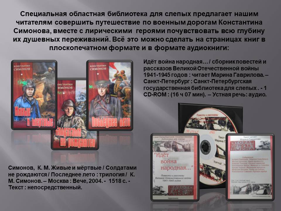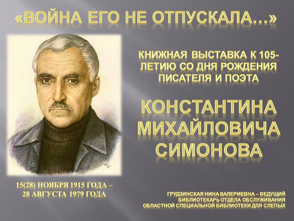 В 2020 году исполняется 105-лет со дня рождения Константина Михайловича Симонова. Константин Симонов, безусловно, был одной из ключевых фигур советской литературы. Поэт, писатель, драматург, публицист, редактор — за 63 года жизни Симонов успел сделать очень много, причем не только создать и опубликовать собственные произведения, но и пробить сквозь цензурные препоны чужие. Отдел обслуживания Областной специальной библиотеки для слепых предлагает вашему вниманию виртуальную книжную выставку «Война его не отпускала» к юбилею К.М. Симонова.