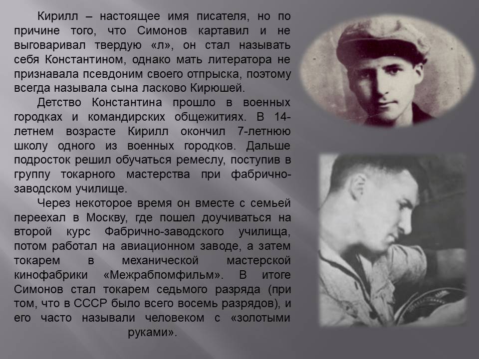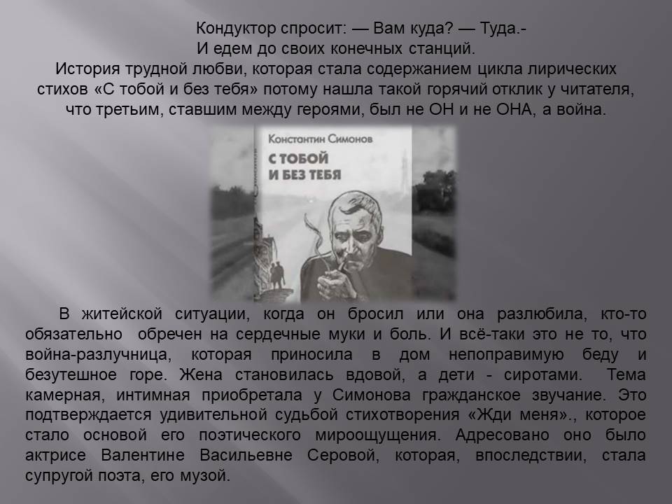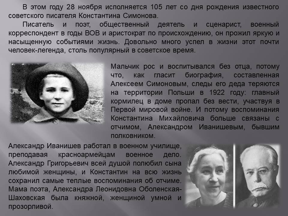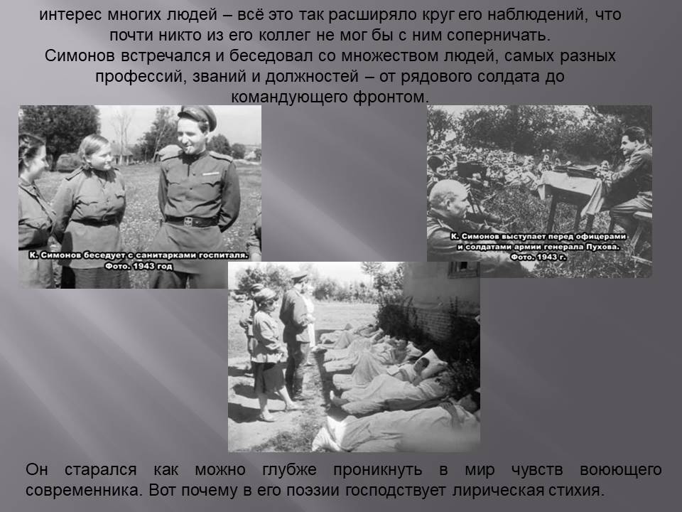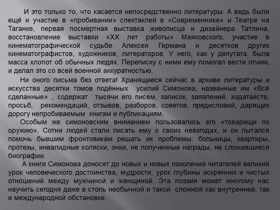 В 2020 году исполняется 105-лет со дня рождения Константина Михайловича Симонова. Константин Симонов, безусловно, был одной из ключевых фигур советской литературы. Поэт, писатель, драматург, публицист, редактор — за 63 года жизни Симонов успел сделать очень много, причем не только создать и опубликовать собственные произведения, но и пробить сквозь цензурные препоны чужие. Отдел обслуживания Областной специальной библиотеки для слепых предлагает вашему вниманию виртуальную книжную выставку «Война его не отпускала» к юбилею К.М. Симонова.