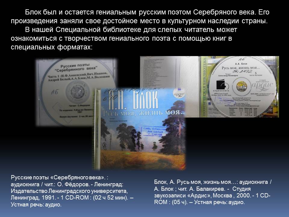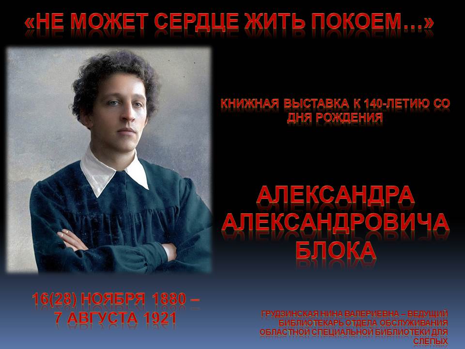 28 ноября 2020 года исполнятся 140 лет со дня рождения поэта. К юбилею А.А. Блока отдел обслуживания Областной специальной библиотеки для слепых подготовил виртуальную книжную выставку «Не может сердце жить покоем».