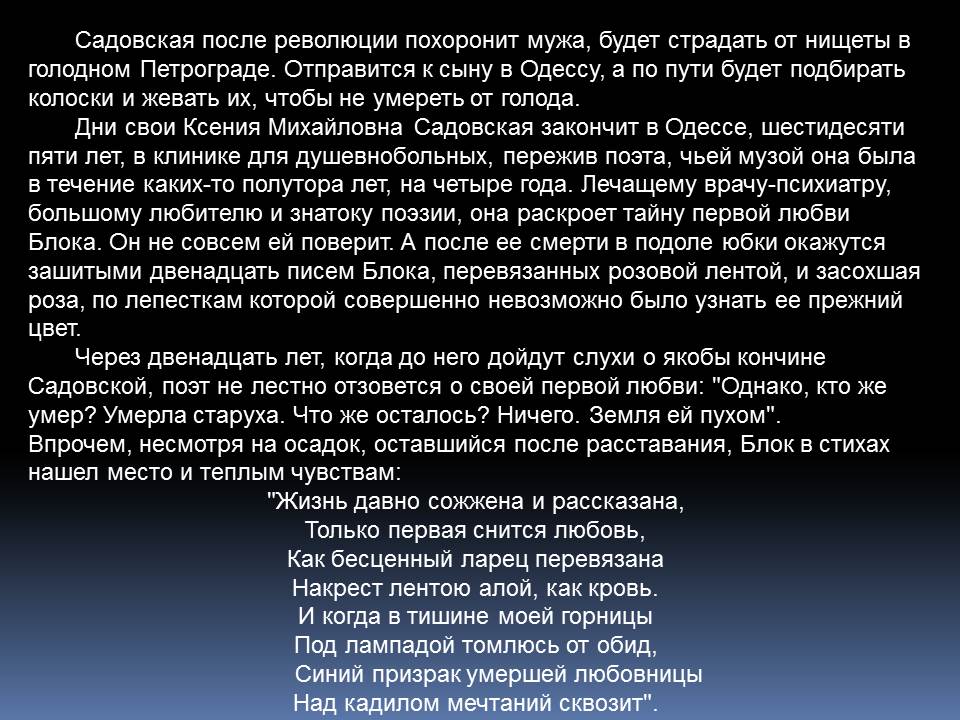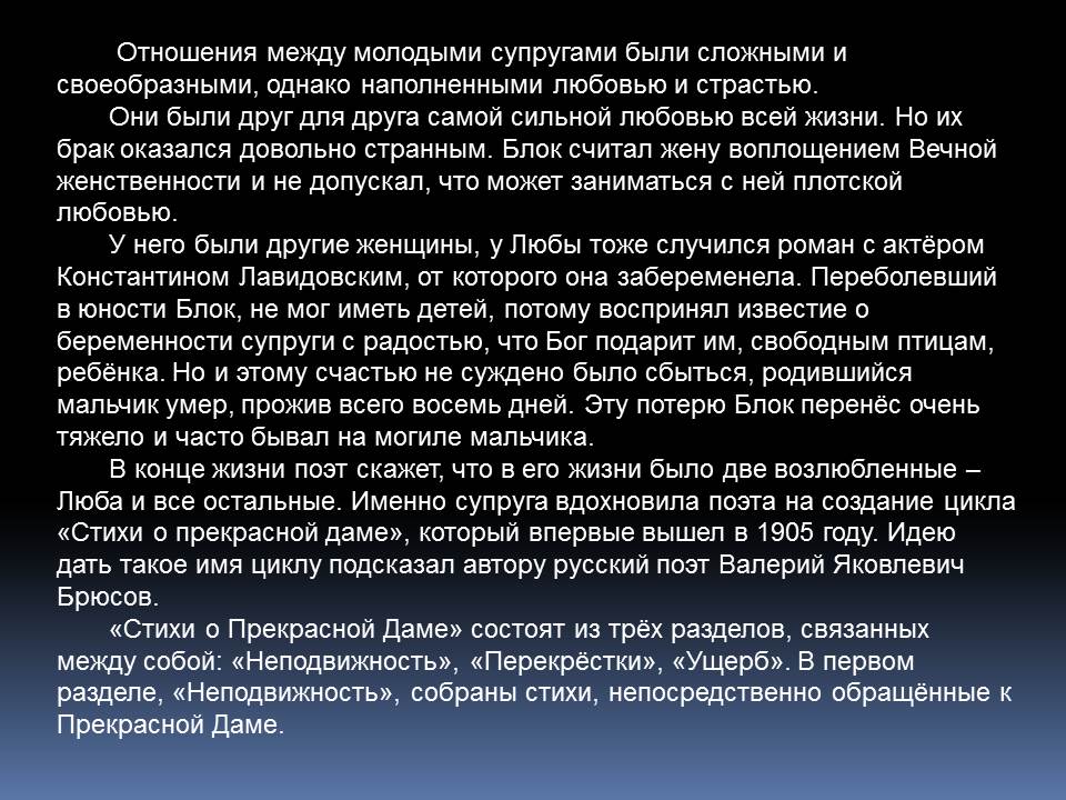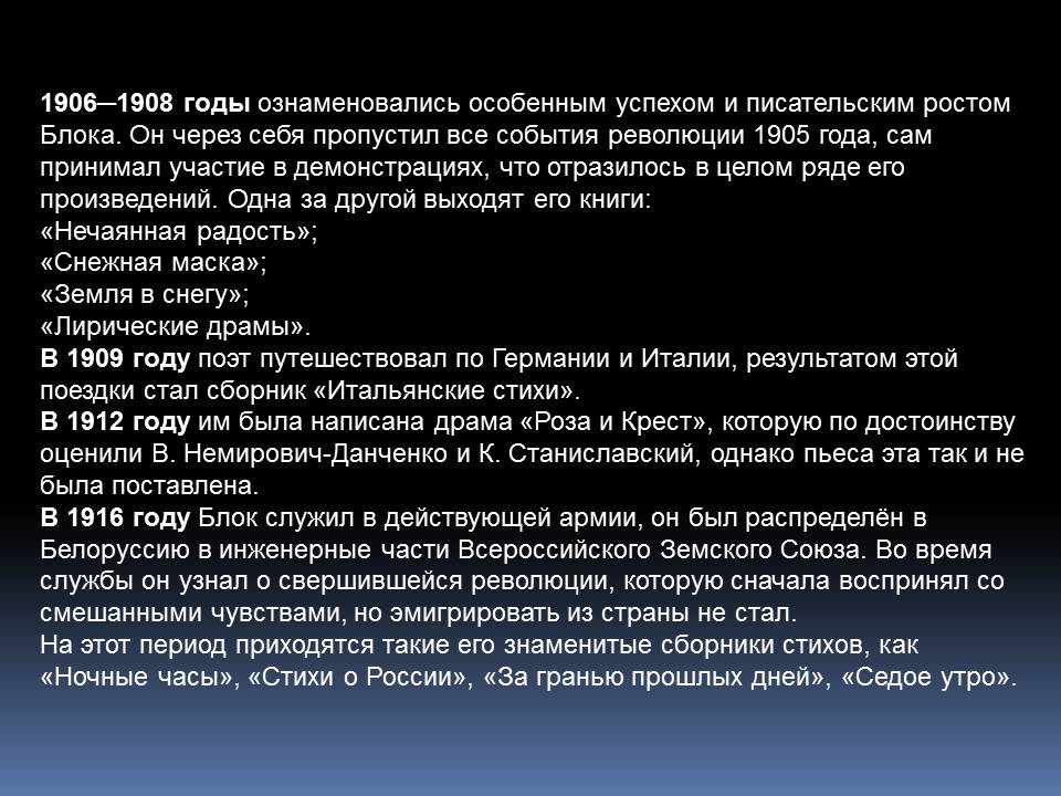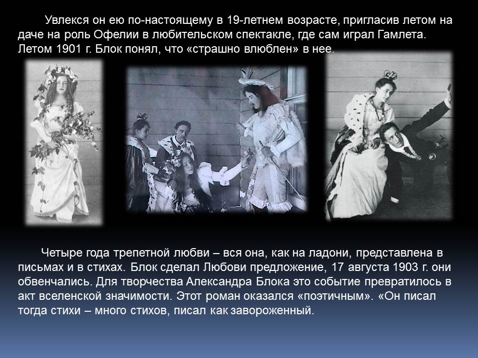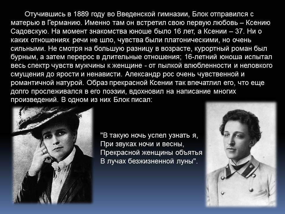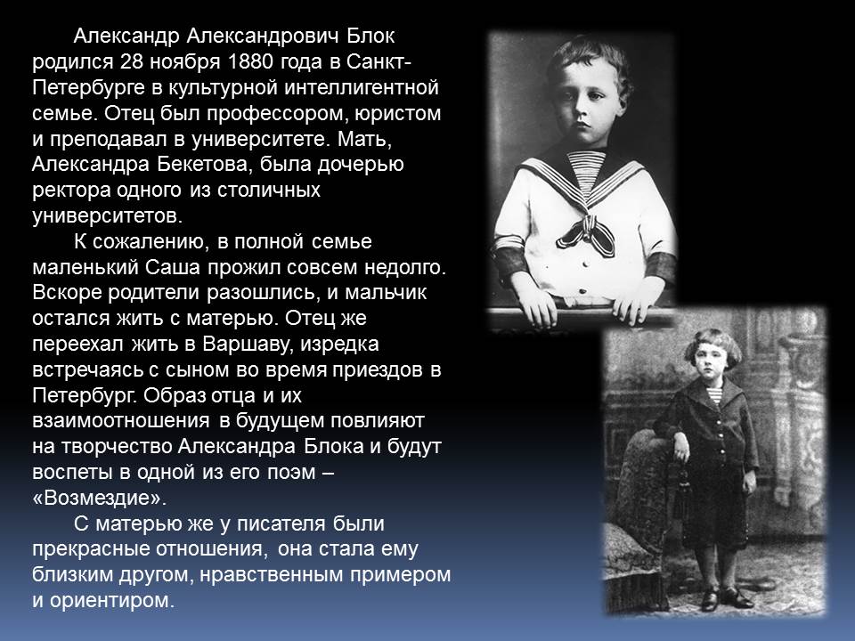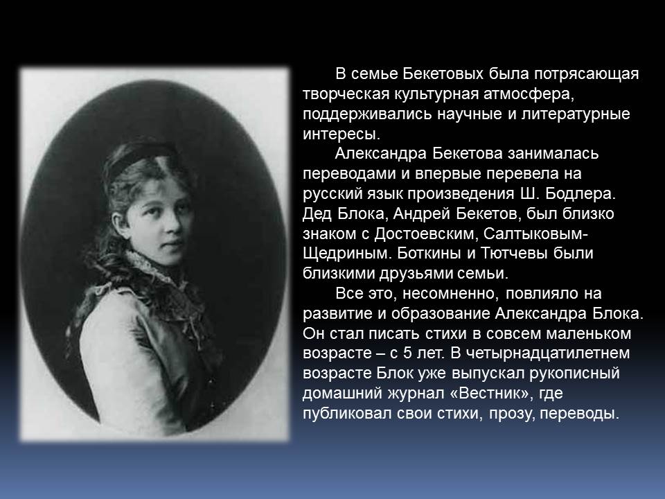 Александр Блок написал свои первые стихи еще до гимназии. В 14 лет он издавал рукописный журнал «Вестник», в 17 – ставил пьесы на сцене домашнего театра и играл в них, в 22 – опубликовал свои стихотворения в альманахе Валерия Брюсова «Северные цветы». Создатель поэтичного и таинственного образа Прекрасной Дамы, автор критических статей, Блок стал одним из самых известных поэтов Серебряного века.