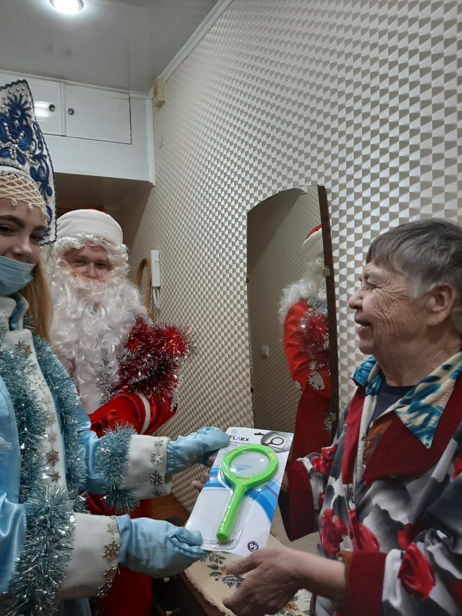 2020 год внес коррективы во многие сферы жизни людей. «Маска», «дистанция», «самоизоляция» - термины, знакомые каждому в период пандемии COVID-19. Появились и освоились новые формы оказания услуг. Взаимоотношения библиотеки и читателей в основном перешли в онлайн формат. Но приближение Нового года - это время чудес, подарков и сюрпризов. Библиотекарь Светлана Чалова организовала новогоднее поздравление пожилых и одиноких читателей с участием Деда Мороза и Снегурочки, в роли которых выступали добровольцы отряда «Волонтёры Победы» БТМСХ, на дому. В течение предновогодней недели волонтёры под руководством сотрудника библиотеки совершили более тридцати поздравительных выездов. Визит артистов стал для людей сказочным сюрпризом! Кроме добрых слов и пожеланий каждый читатель получил подарок от Деда Мороза. Подарки были разные, но крайне необходимые людям с нарушением зрения – «говорящие» будильники, тифлофлешплееры, увеличительные лупы.