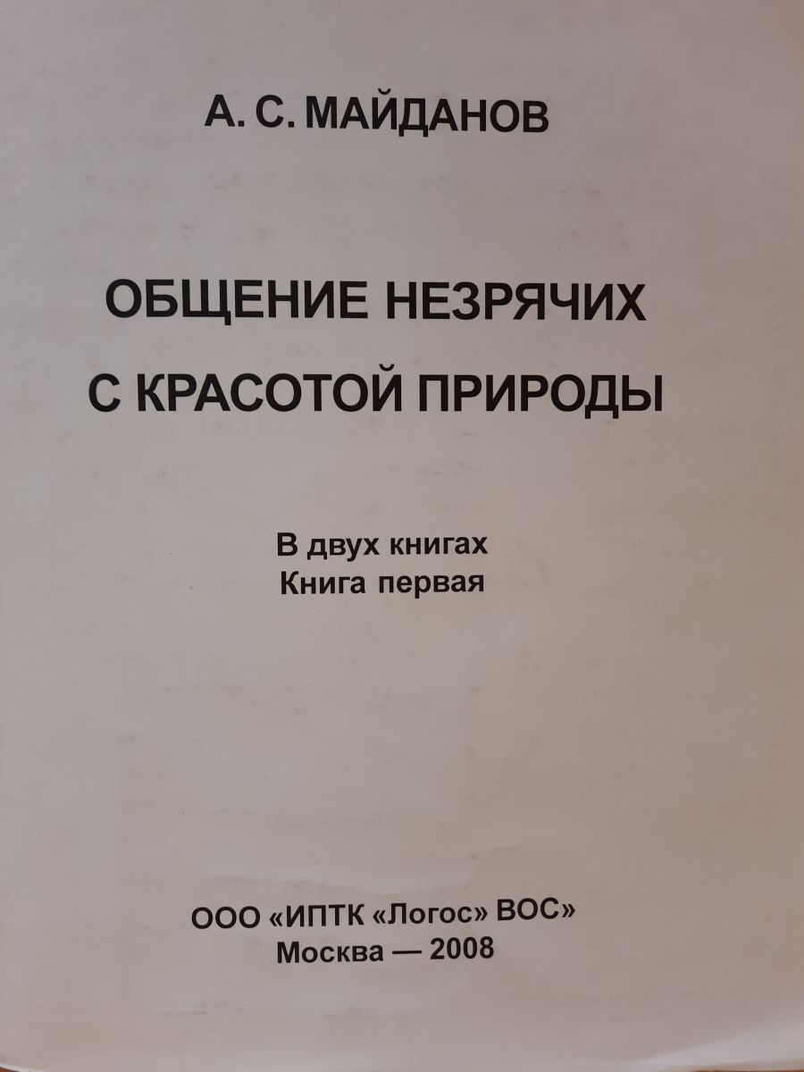 Майданов, Анатолий Степанович. Общение незрячих с красотой природы / А. С. Майданов. - Москва : Логосвос, 2008. - 2 кн. .- Текст (тактильный) : непосредственный.