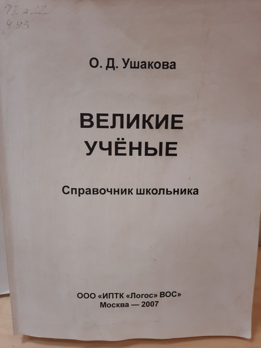 Ушакова, Ольга Дмитриевна. Великие ученые : справочник школьника / О. Д. Ушакова. - Москва : Логос ВОС, 2007. - 1 кн. - Перепеч. с изд. : СПб. : Литера, 2005. - Текст (тактильный) : непосредственный.