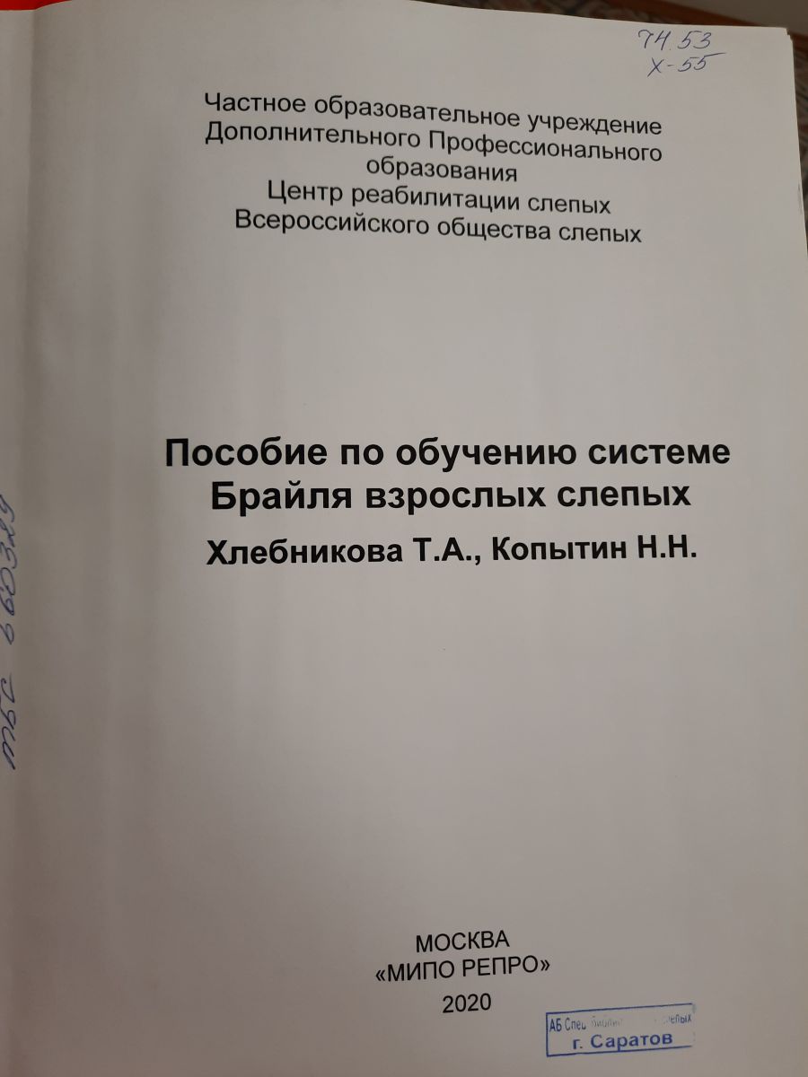 Хлебникова, Татьяна Анатольевна. Пособие по обучению системе Брайля взрослых слепых / Т. А. Хлебникова, Н. Н. Копытин ; Частное образовательное учреждение дополнительного профессионального образования, Центр реабилитации слепых Всероссийского общества слепых. - Москва : Репро, 2020. - 1 кн.; 30 см 200 экз. - Текст (тактильный) : непосредственный.