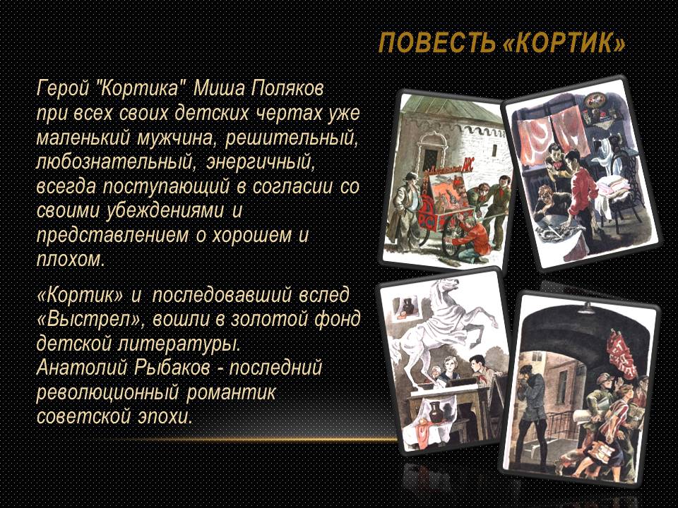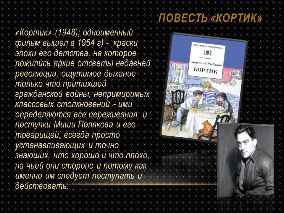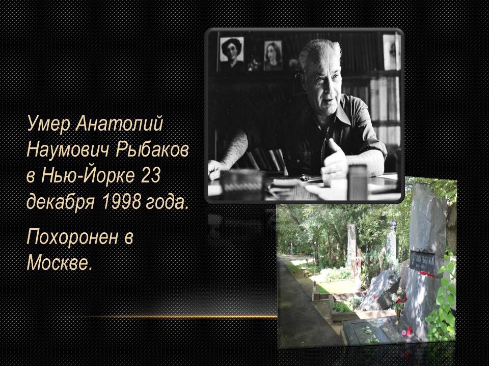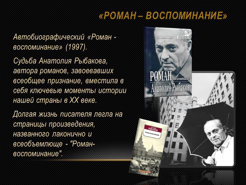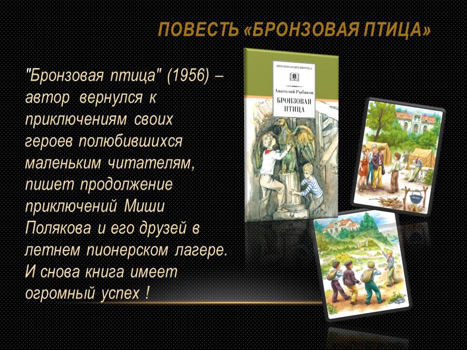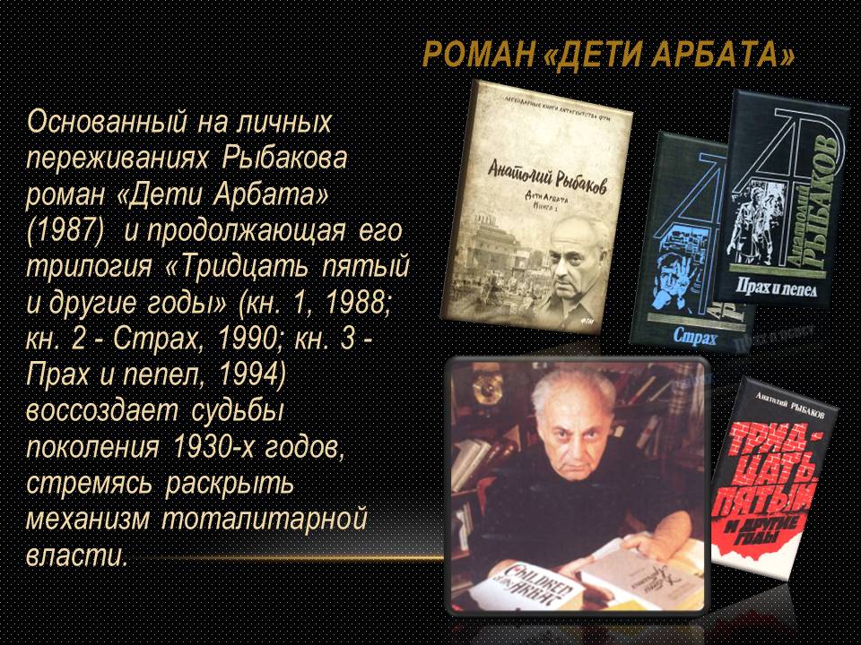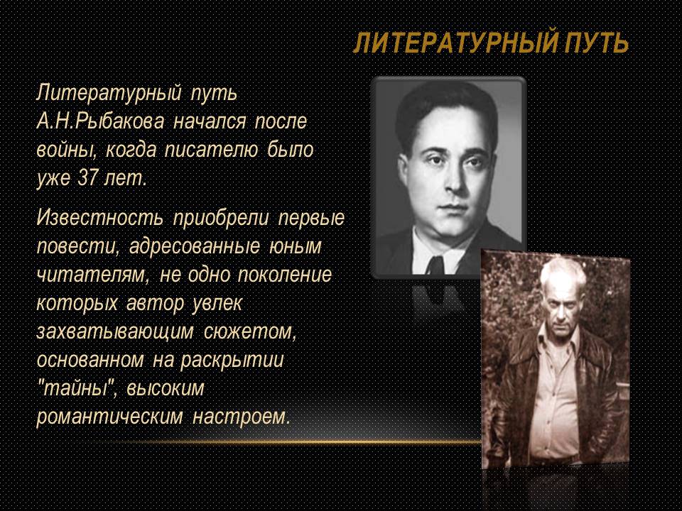 Талантливые книги А. Рыбакова захватывают напряжённостью развития сюжета, лёгкостью стиля. Автор книг жил в сложное время, но не потерял свою честь, мужество и человеческое достоинство. Пройдя через тяжёлые испытания, Рыбаков создал произведения, которые учили и учат добру, справедливости, высокой нравственности.