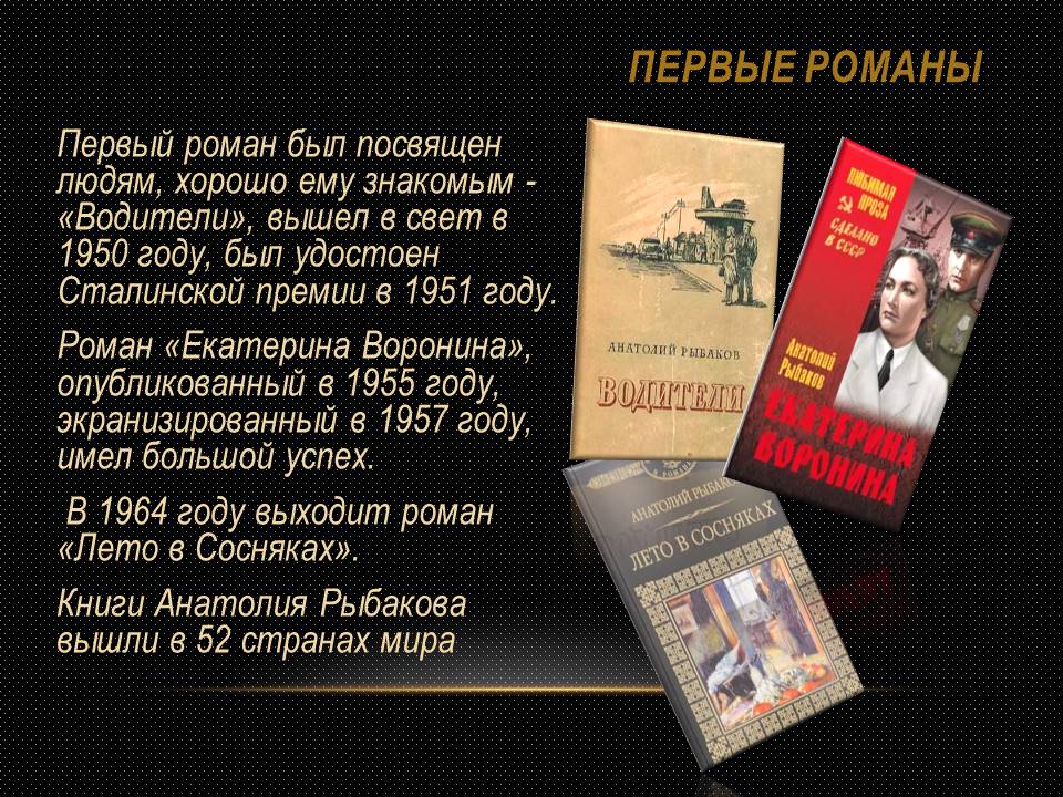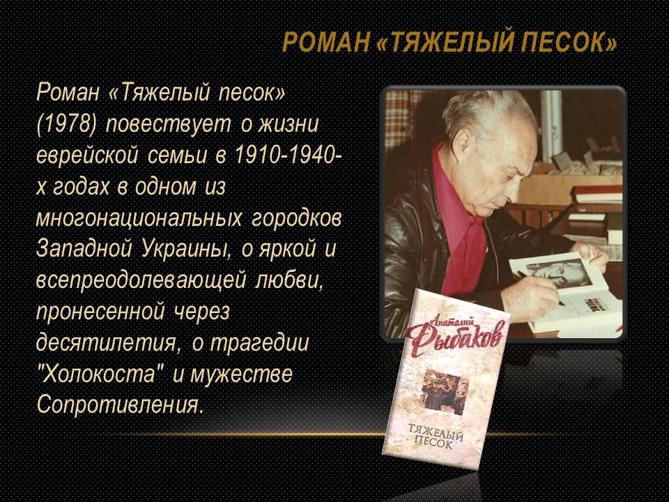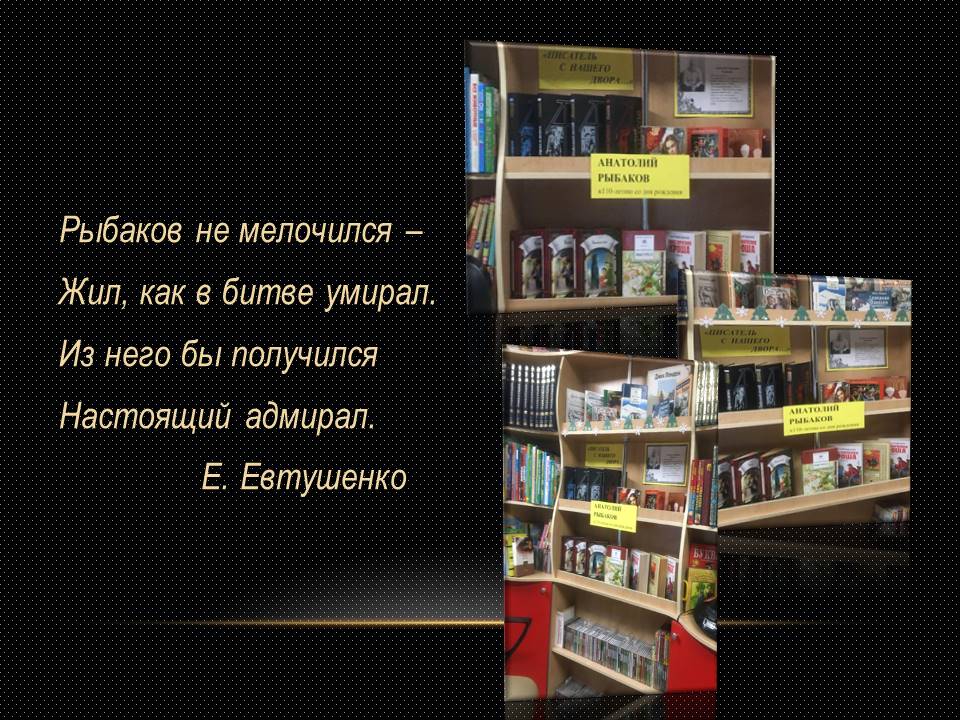 На книжной выставке представлены легендарные повести «Кортик», «Бронзовая птица», принесшие автору мировую известность; популярнейший, многоплановый роман «Дети Арбата», затронувший трагическую тему культа личности Сталина; изумительный и трогательный роман «Тяжёлый песок» и другие.