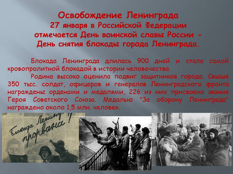 27 января 2021 года мы отмечаем 77-летие освобождения Ленинграда от фашистской блокады. Ровно 76 лет назад в январе 1944 года Ленинград отпраздновал свою Победу. Победу тех, кто сражался с врагом, чтобы отстоять родной город, кто пережил все тяготы жесточайшей блокады, кто жил и боролся, несмотря на холод и голод, бомбежки и артобстрелы.