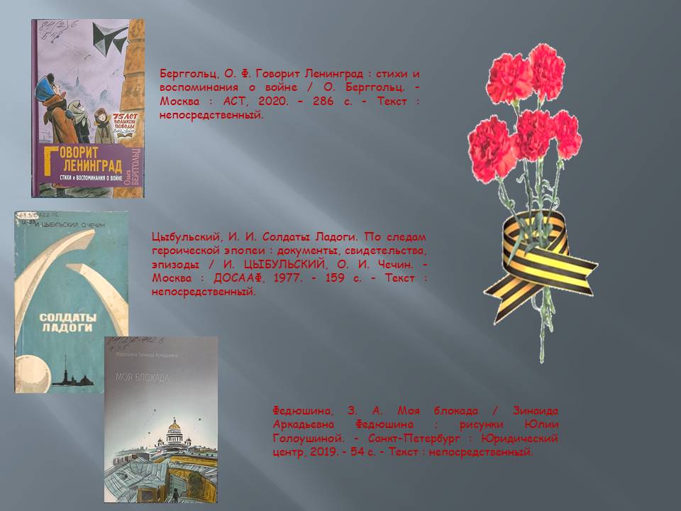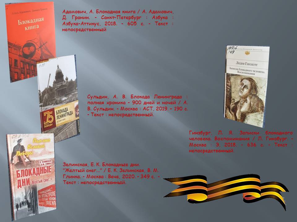 В библиотеке оформлена книжная выставка «Отстоять и не сдаться!». На выставке представлена документальная литература, отображающая хронику блокадного Ленинграда. Кроме того, читатели библиотеки могут познакомиться с художественными произведениями о блокадном Ленинграде, авторы которых были свидетелями тех страшных дней: А. Адамович, Д. Гранин «Блокадная книга», Зинаида Федюшина «Моя блокада», Елена Зелинская «Блокадные дни. "Жёлтый снег..."», Ольга Берггольц, «Говорит Ленинград : стихи и воспоминания о войне» и т.д.