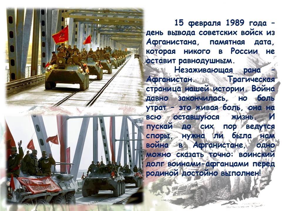 15 февраля 1989 года был завершен вывод Советских войск из Афганистана.