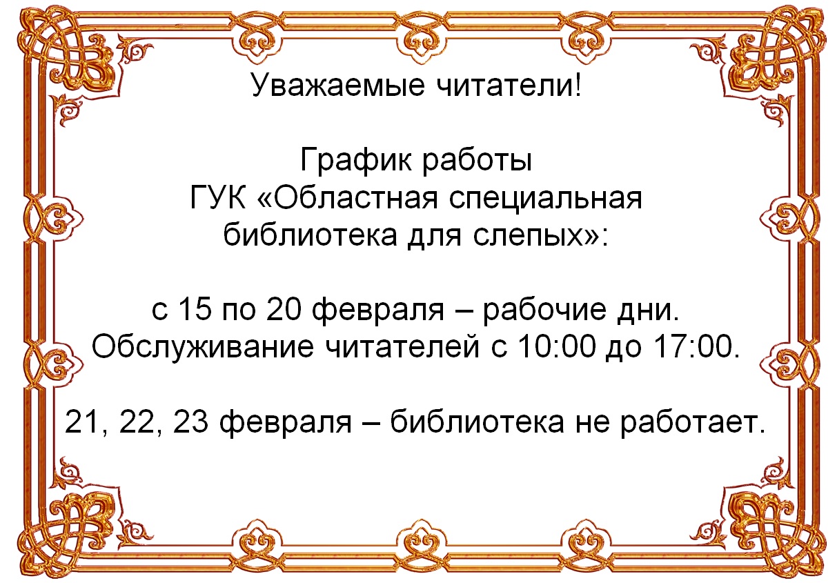с 15 по 20 февраля – рабочие дни. Обслуживание читателей с 10:00 до 17:00.