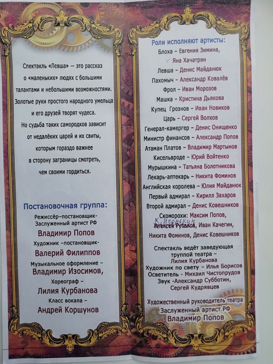 В рамках празднования Международного дня культуры администрация БДТ предоставила людям с ограниченными возможностями здоровья возможность бесплатно посмотрели спектакль «Левша». Спектакль «Левша» - это рассказ о «маленьких» людях с большими талантами и небольшими возможностями, судьба которых зависит от недалеких царей и их свиты. Режиссёр-постановщик спектакля - Заслуженный артист РФ, художественный руководитель театра Владимир Попов. С первых минут представления артисты смогли всецело завладеть вниманием зрителя, которые неустанно восхищались актерской игрой, красотой костюмов и декораций.