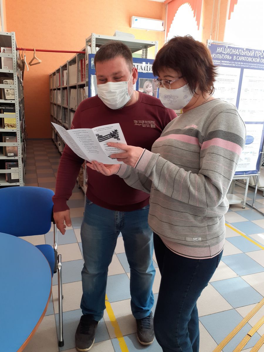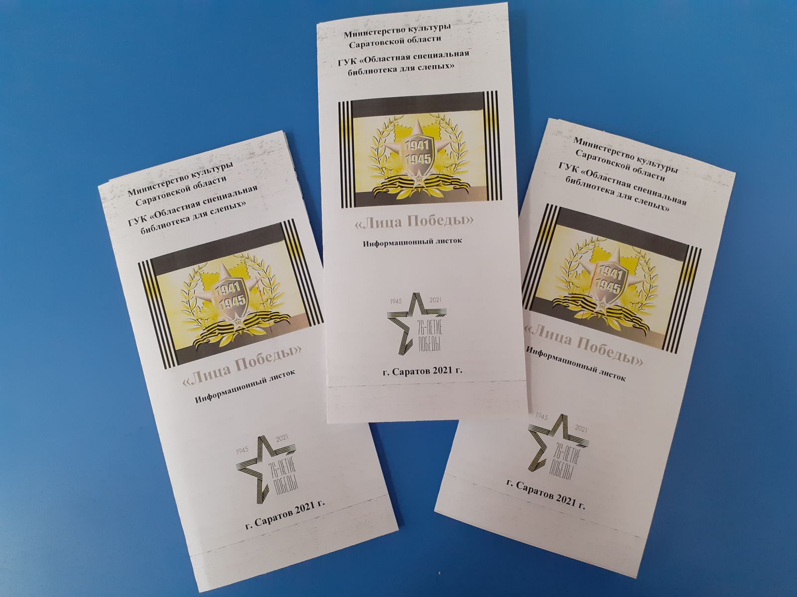 30 апреля 2021 года сотрудники ГУК «Областная специальная библиотека для слепых» по адресу ул. 1-я Садовая, 4 провели акцию ко Дню Победы «Лица Победы». Были подготовлены буклеты с информацией о городе Саратове в годы Великой Отечественной войны 1941-1945 годов. В буклетах представлена информация о том, что более 100 крупных предприятий было эвакуировано в наш город, 35 из которых являлись крупнейшими оборонными заводами страны, о доблестном труде пенсионеров, женщин и подростков на авиационном и нефтеперерабатывающем и других заводах, выполнявших несколько норм в день, о госпиталях, в том числе под руководством профессора С.Р. Миротворцева, возвращавших в строй наших бойцов, о пожертвовании личных денег на приобретение военной техники, зачинателями которого стали труженики саратовского колхоза «Сигнал революции», Ф.П. Головатый и А.С. Селиванова. А также о том, что наш город получил звание Города трудовой доблести, увековечив тем самым подвиг тружеников тыла Великой Отечественной войны. Эта информация заставят подрастающее поколение задуматься о подвиге миллионов их предков, земляков.