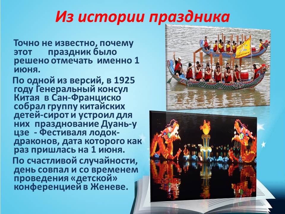 Считается, что впервые праздник ребенка организовал еще в 1925 году китайский консул в США, в городе Сан-Франциско. Он пригласил к себе детей, у которых не было родителей, и устроил им настоящий праздник. С тех пор подобные мероприятия стали проходить каждый год.