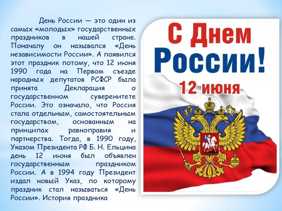 12 июня – День России – это праздник свободы, гражданского мира и доброго согласия всех людей на основе закона и справедливости. День России – символ национального единения и общей ответственности за настоящее и будущее нашей Родины. К этому дню Сектор «говорящих» книг Центра адаптивного чтения Областной специальной библиотеки для слепых подготовил виртуальную книжную выставку «Россия – родина моя». На выставке предоставлена информация об истории нашей Родины, государственным символам страны, великих людях России.