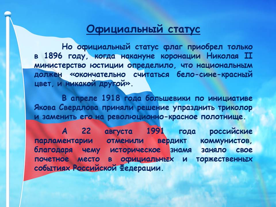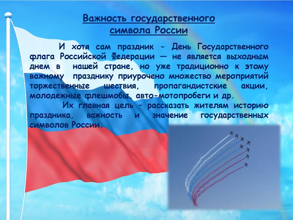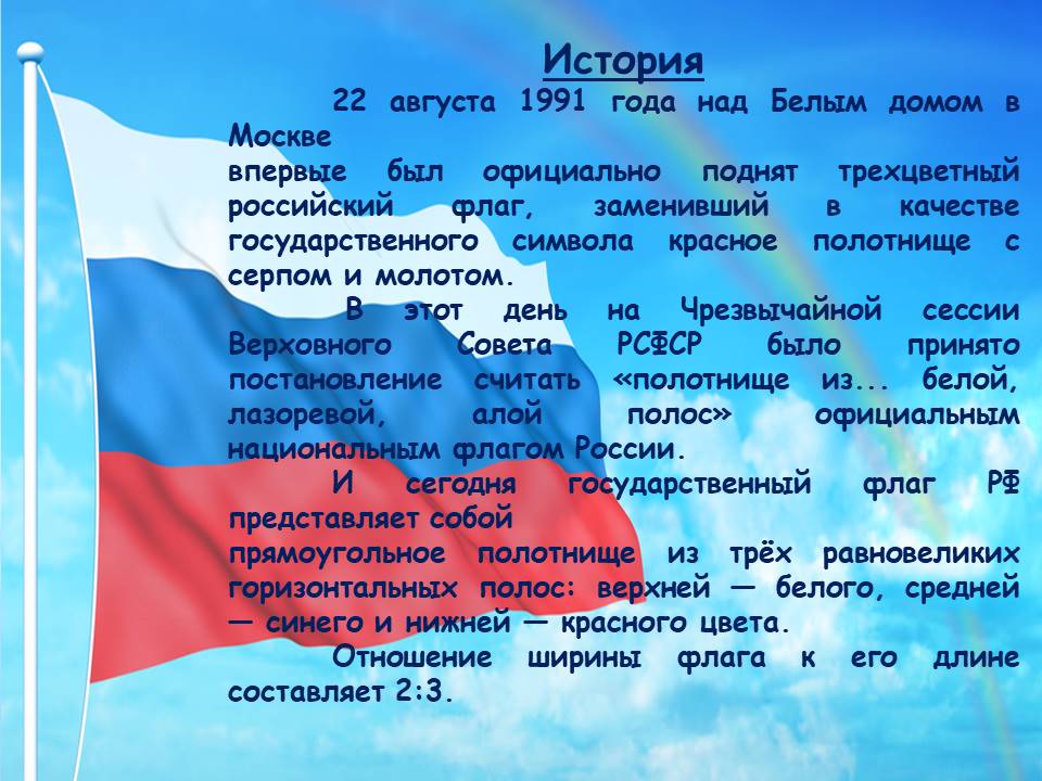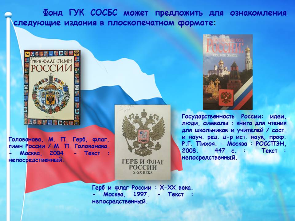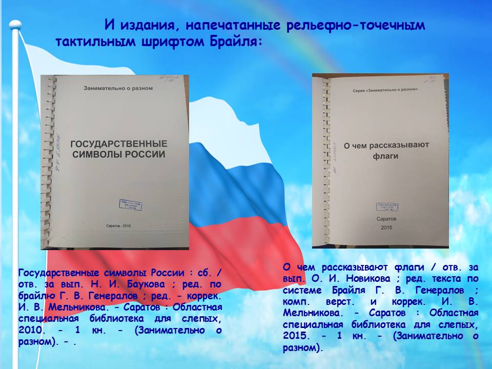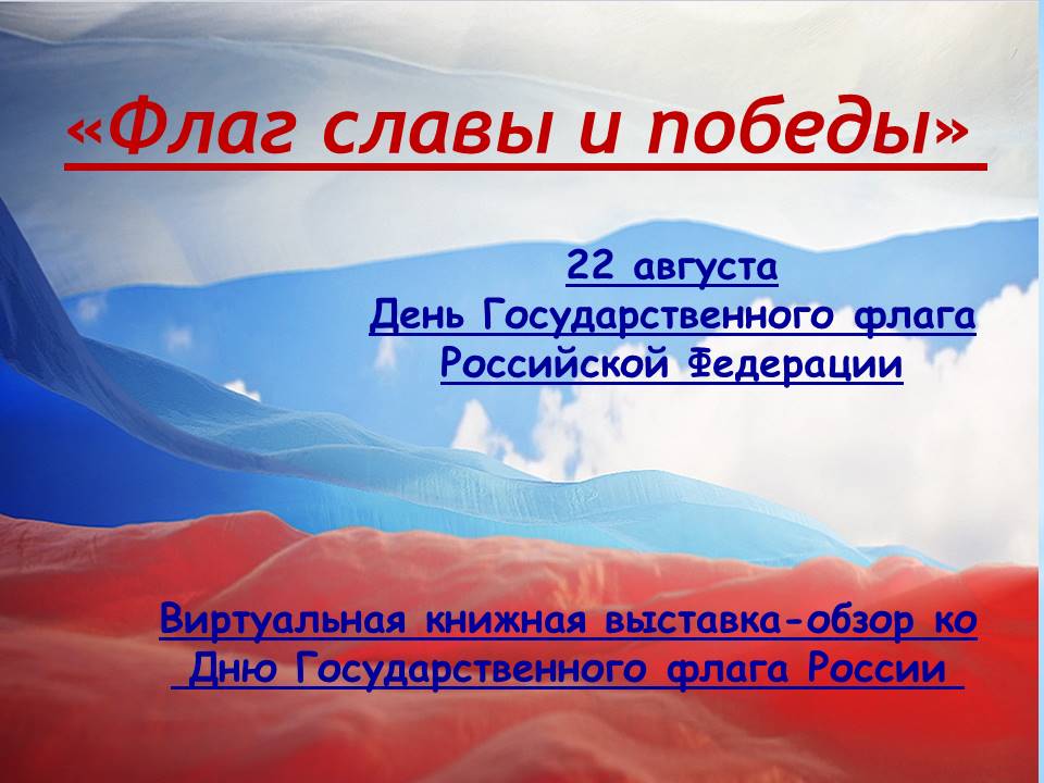 В Областной специальной библиотеке для слепых подготовлена виртуальная выставка «Флаг славы и победы». Пользователям представлена информация об истории возникновения и утверждения флага, как одного из символов государства российского. Читатели познакомятся с книгами из фонда библиотеки о государственной символике, которые будут представлены на книжной выставке.