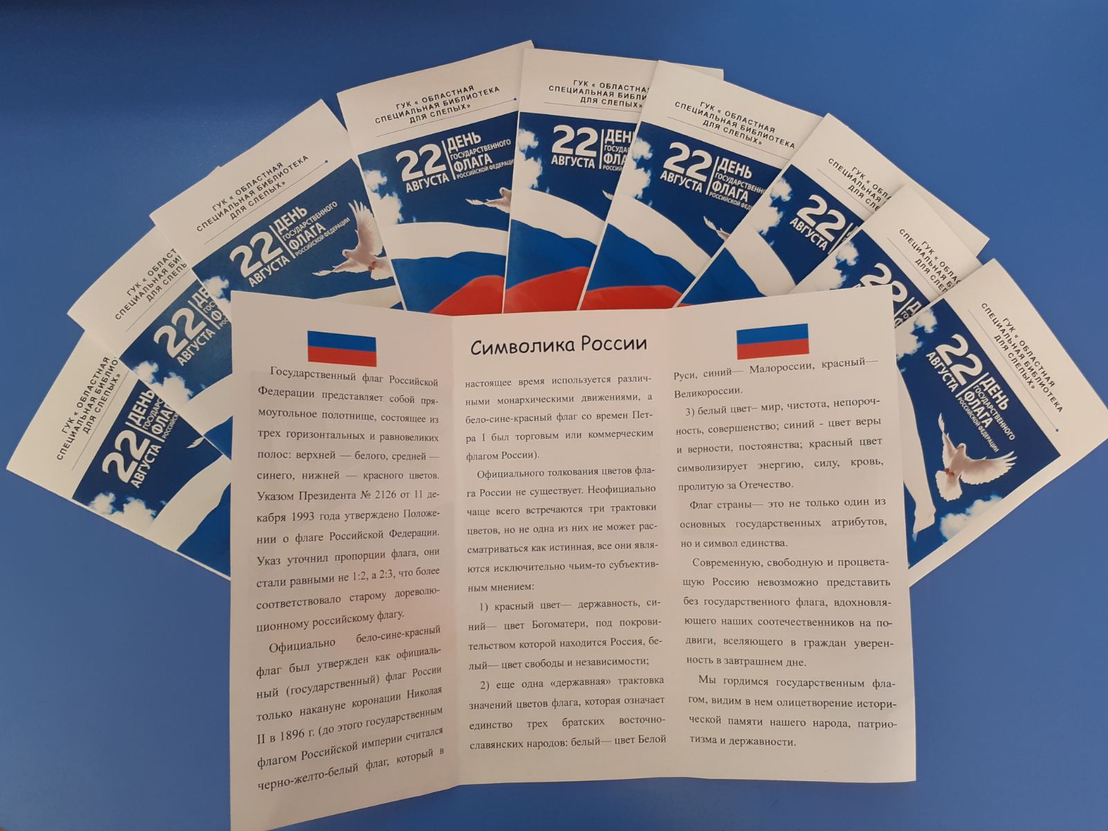 Сотрудники Областной специальной библиотеки для слепых по адресу ул. 1-я Садовая, 4 ко Дню Государственного флага Российской Федерации провели акцию «Три цвета России». В рамках акции подготовлены и розданы буклеты с информацией о Дне Государственного флага, истории флага, символике его цветов. Участниками акции стали читатели библиотеки всех возрастов, прохожие.