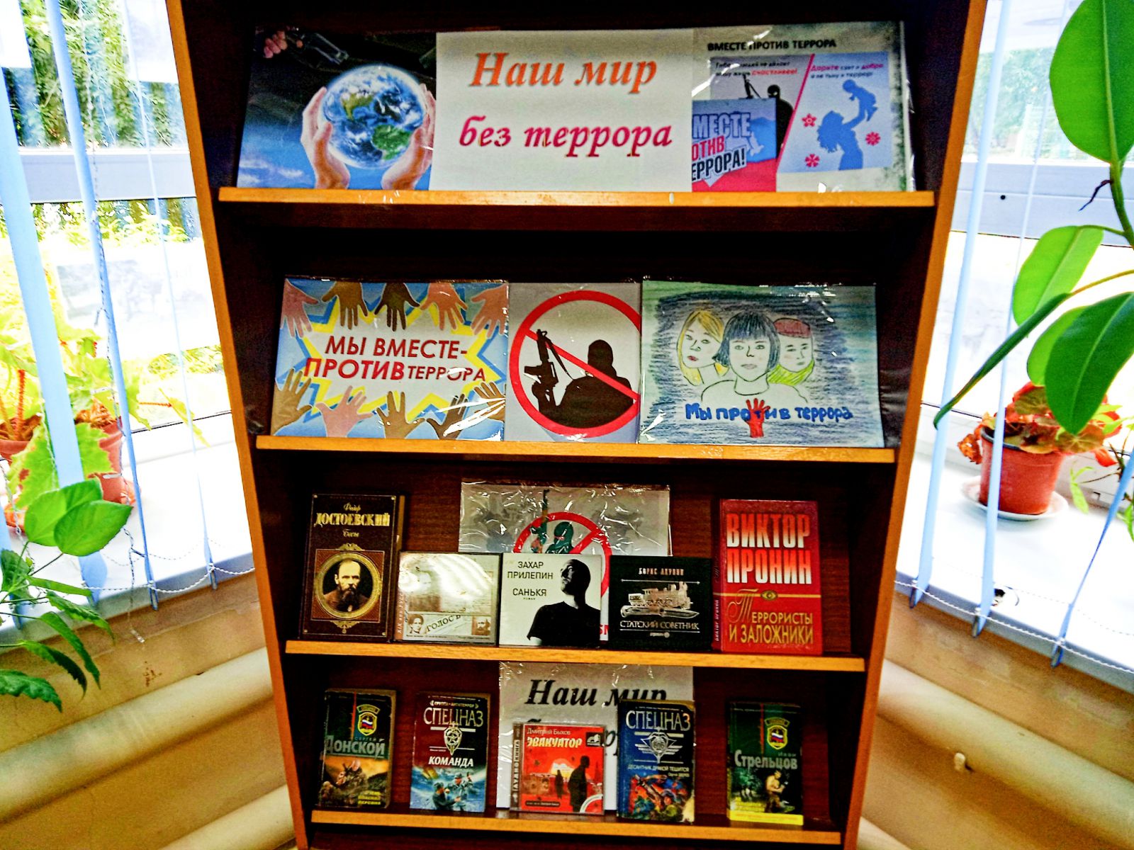 Предлагаем вашему вниманию подборку книг современных российских прозаиков, а также классиков, в которых поднимается тема терроризма. Данные книги можно найти в фонде нашей библиотеки. На выставке представлены книги, отражающие историю террора; современный терроризм и меры борьбы с ним; о правилах поведения в случае совершения теракта; как себя вести, если вы стали жертвой террористов. Выставка адресована широкому кругу читателей в целях формирования системы общественной безопасности и противодействия экстремизму и терроризму.