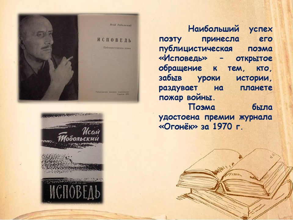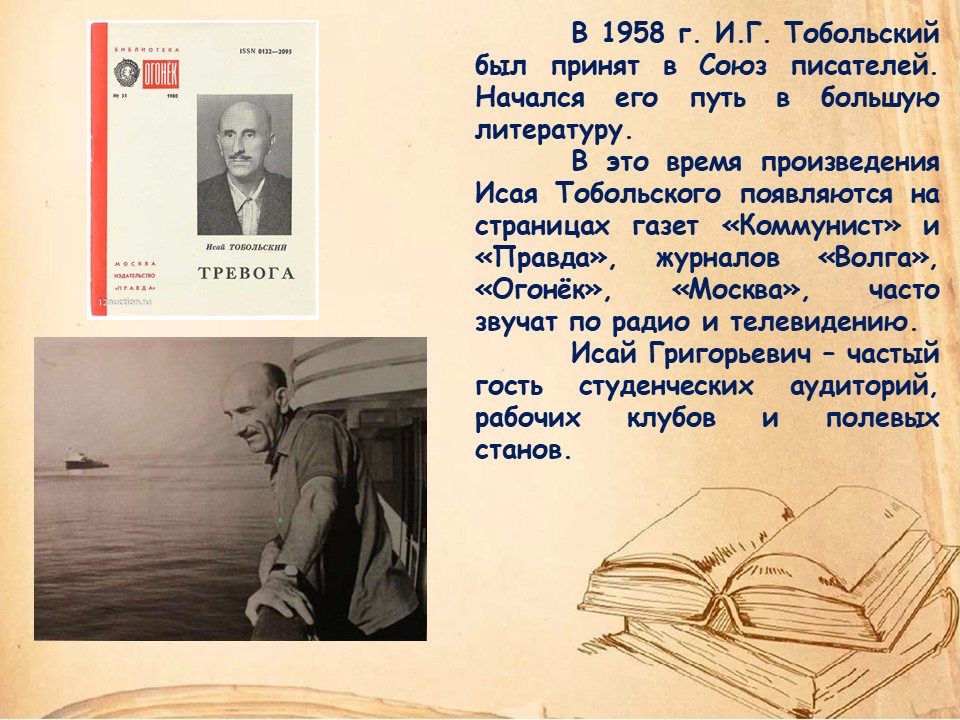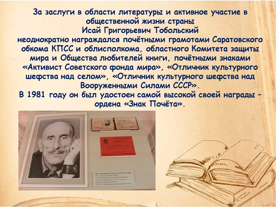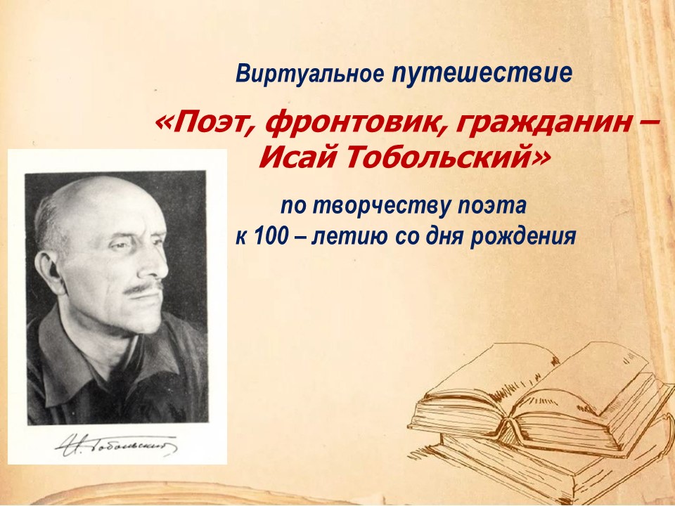 26 августа 2021 года исполнилось 100 лет со дня рождения поэта, Члена Союза писателей, Лауреата премии журнала «Огонёк» Исая Тобольского.