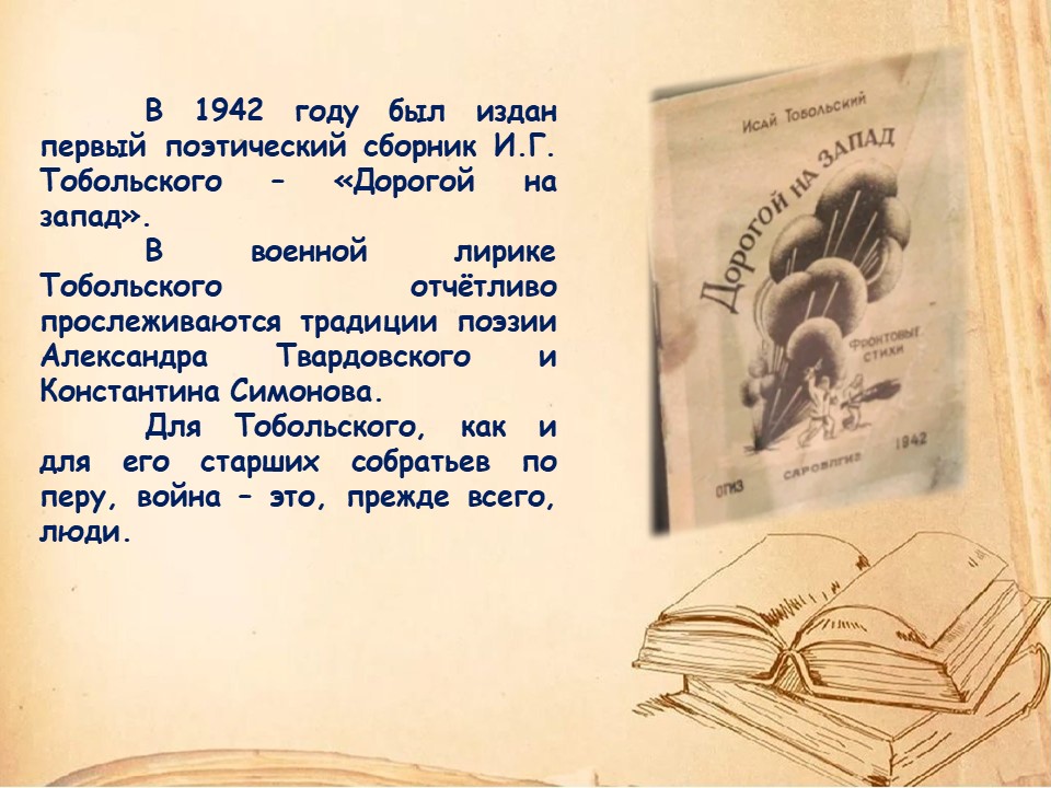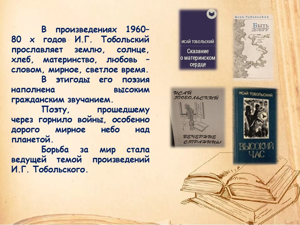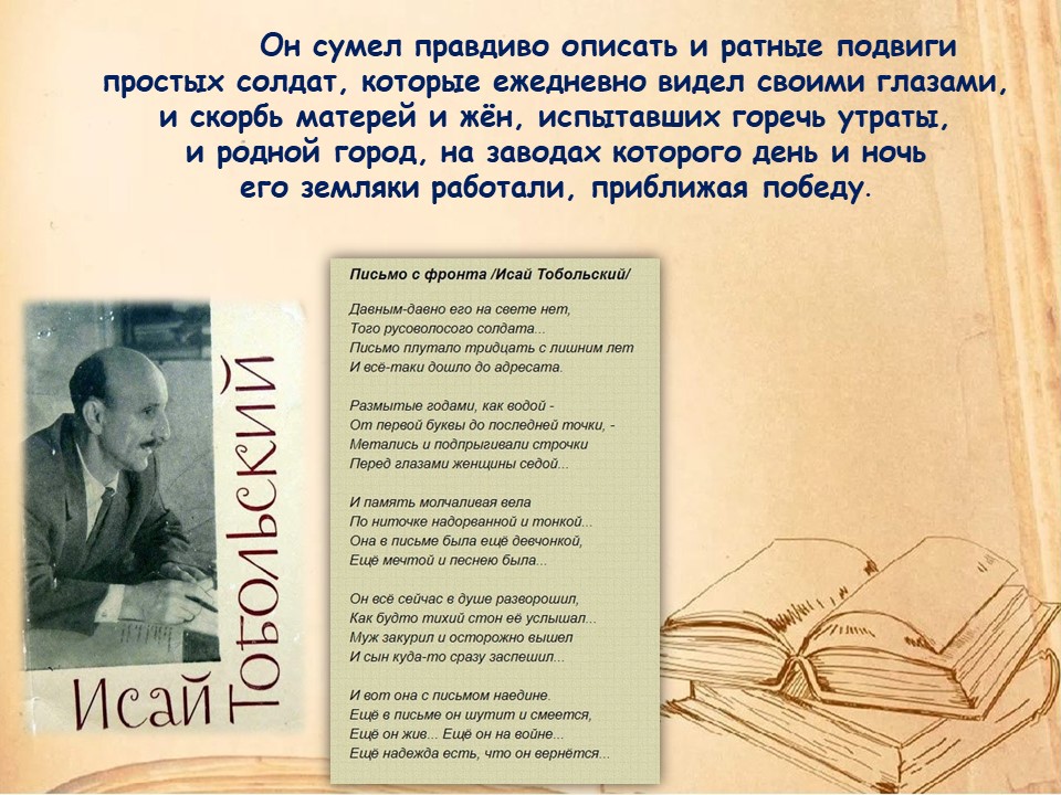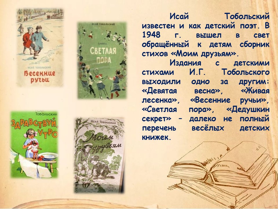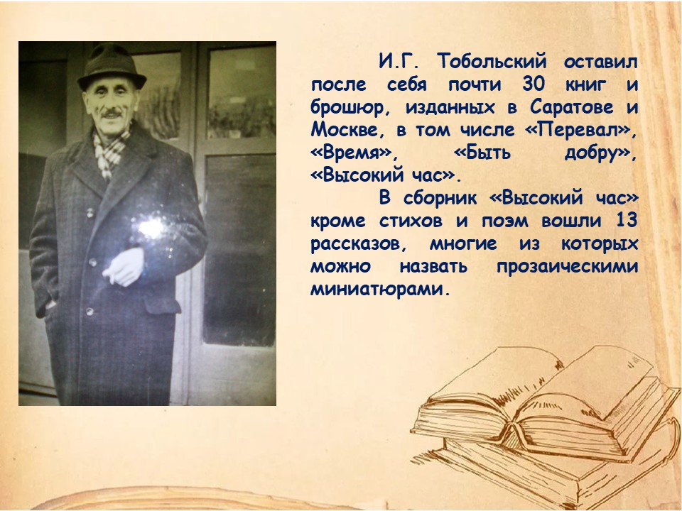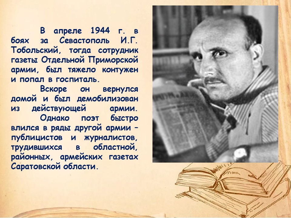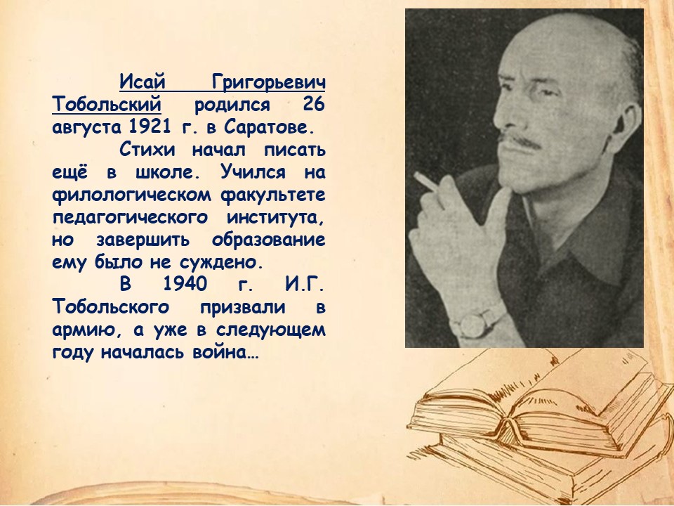 И. Тобольский. Родился в Саратове в семье рабочего. Стихи начал писать ещё в школе. Автор около 30 поэтических книг, изданных в Саратове и Москве. Многие произведения Исая Тобольского объединяет такая характерная черта, как высокая гражданственность, гордость за свою страну, народ, историю, культуру.