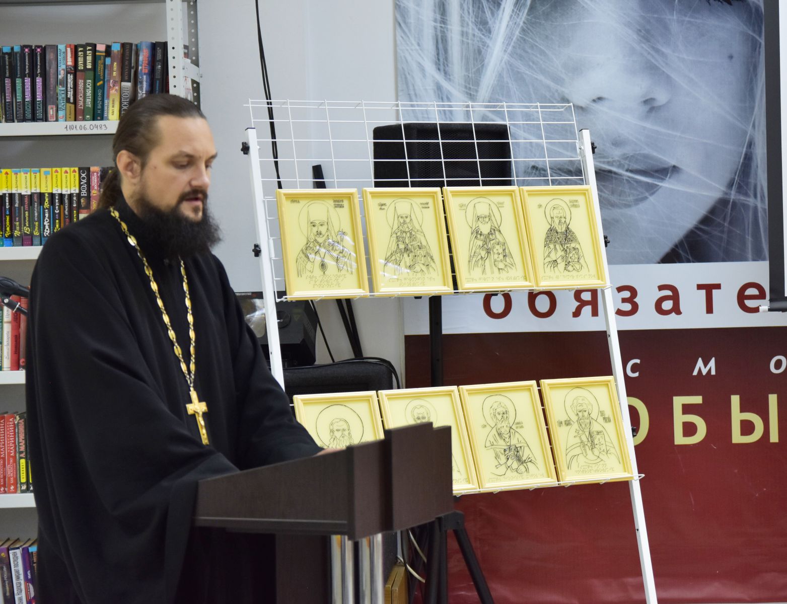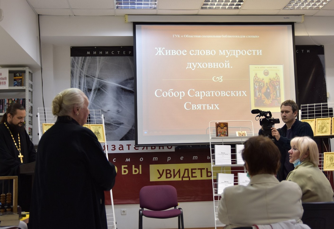 Сегодня в Областной специальной библиотеке для слепых состоялось мероприятие "Живое слово мудрости духовной" совместно с настоятелем храма Страстей Господних отцом Кириллом. Директор Ольга Новикова рассказала о значимых проектах, реализованных отцом Кириллом совместно с волонтёрами такие как "Тактильные книги, для слепых и слабовидящих детей", проект по изготовлению тактильных книг и икон саратовских святых. Отец Кирилл рассказал о тактильной выставке, представленной в библиотеке, как дополнительной возможности восприятия портретов саратовских святых.