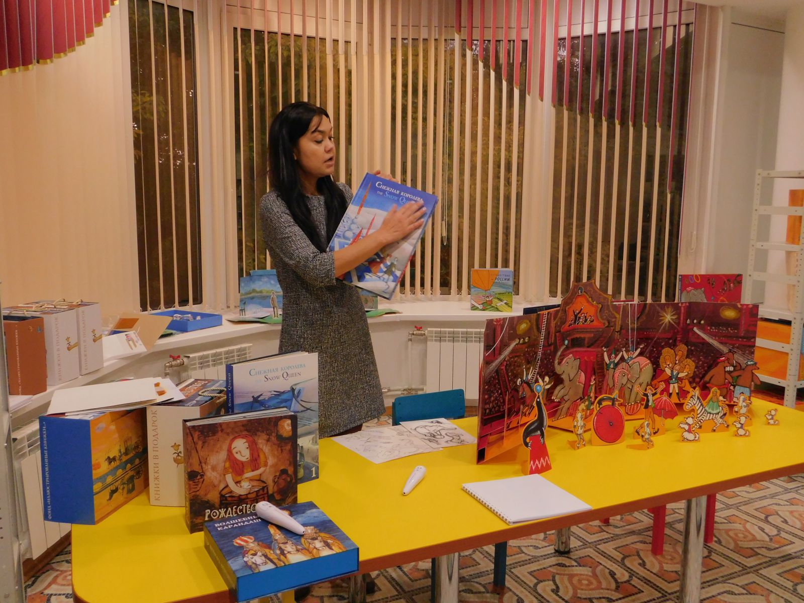 Директор с удовольствием предоставила слово Ольге Сорокиной, которая провела презентацию тактильных книг «Рождество», «Снежная королева», «Цирк». С большим интересом сотрудники библиотеки и все присутствовавшие на мероприятии прослушали историю рождения таких замечательных и нужных библиотекам для слепых книг.
