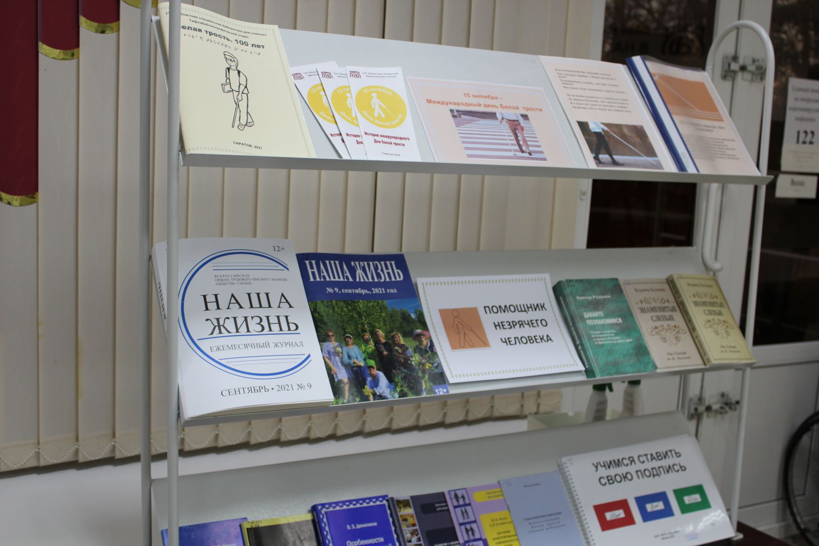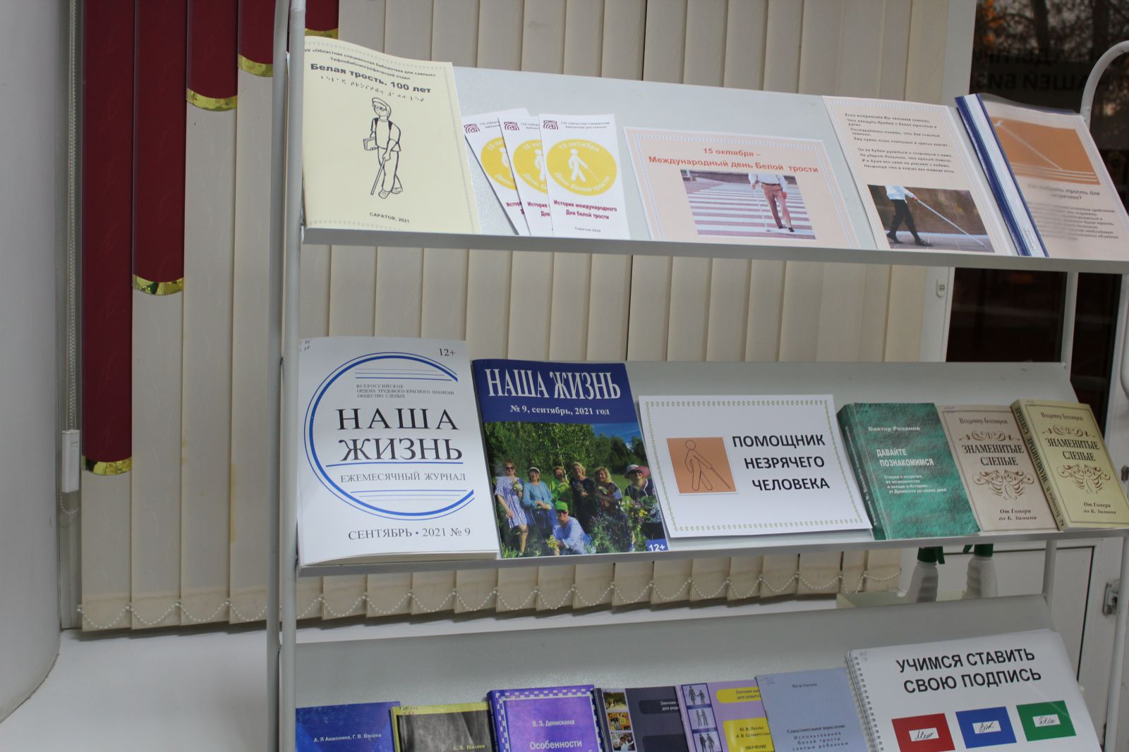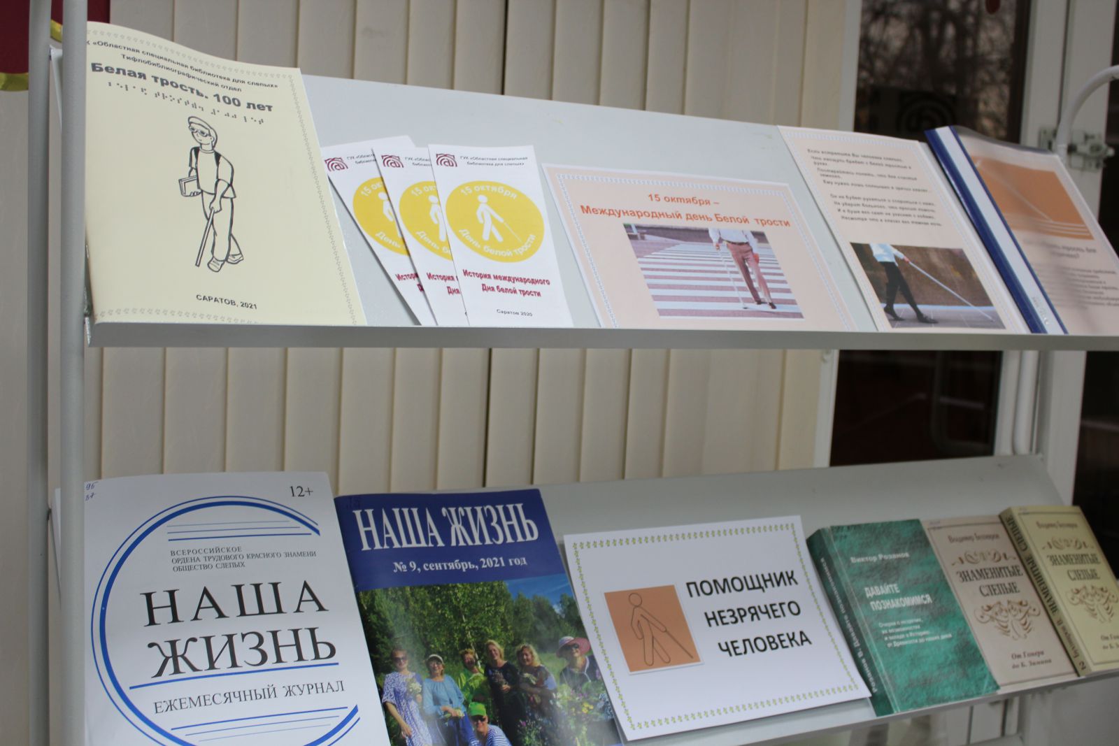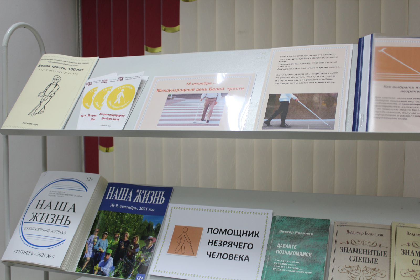 15 октября во всём мире отмечается Международный День белой трости. 2021 год – год особенный. Ровно 100 лет назад белая трость стала символом незрячего человека. Этот День призван напомнить обществу о существовании рядом людей с ограниченными физическими возможностями, о помощи и о солидарности. К Международному дню белой трости тифлобиблиографический отдел Областной специальной библиотеки для слепых подготовил выставку-инсталляцию «Помощник незрячего человека», посвящённую белой трости. На выставке представлены книги, журналы в специальных форматах о жизни незрячих, материалы из истории «белой трости», а также сборник материалов Областной специальной библиотеки для слепых «Белая трость. 100 лет», выпущенный к этой дате. Пособие содержит справочные материалы об основных датах, событиях, исторических личностях, формах мероприятий, которые помогут организовать и провести в библиотеке Месячник Белой трости.