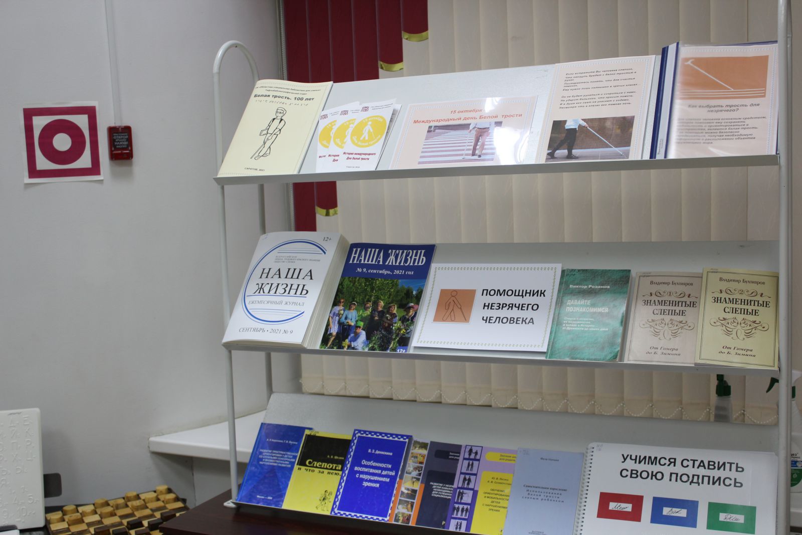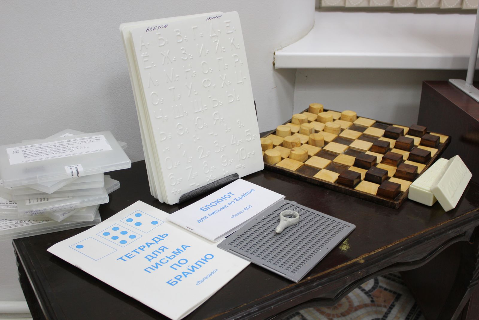 На выставке представлены шашки и домино для незрячих, прибор и грифель для письма по Брайлю, тетрадь и блокнот для письма по Брайлю, азбука Брайля для незрячих.