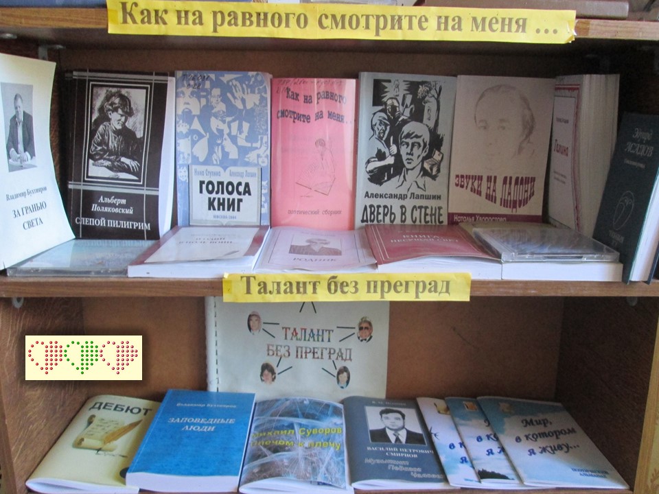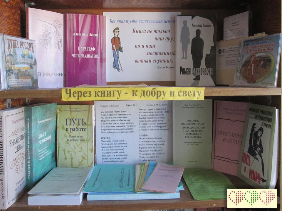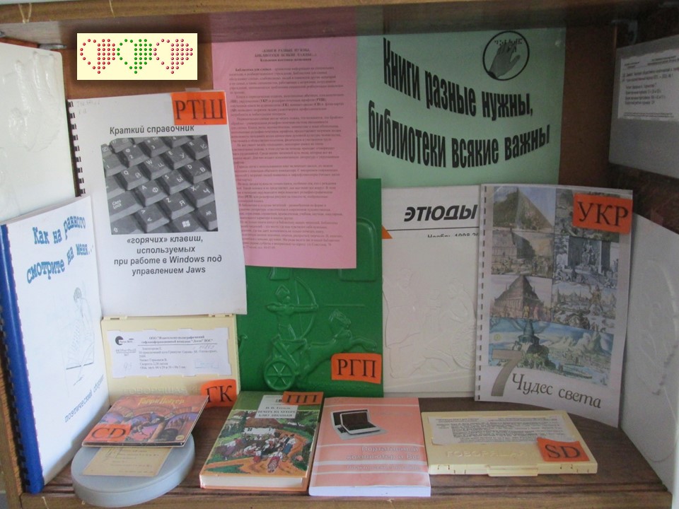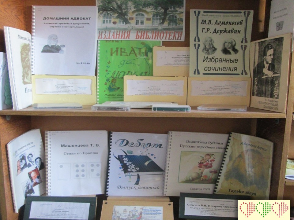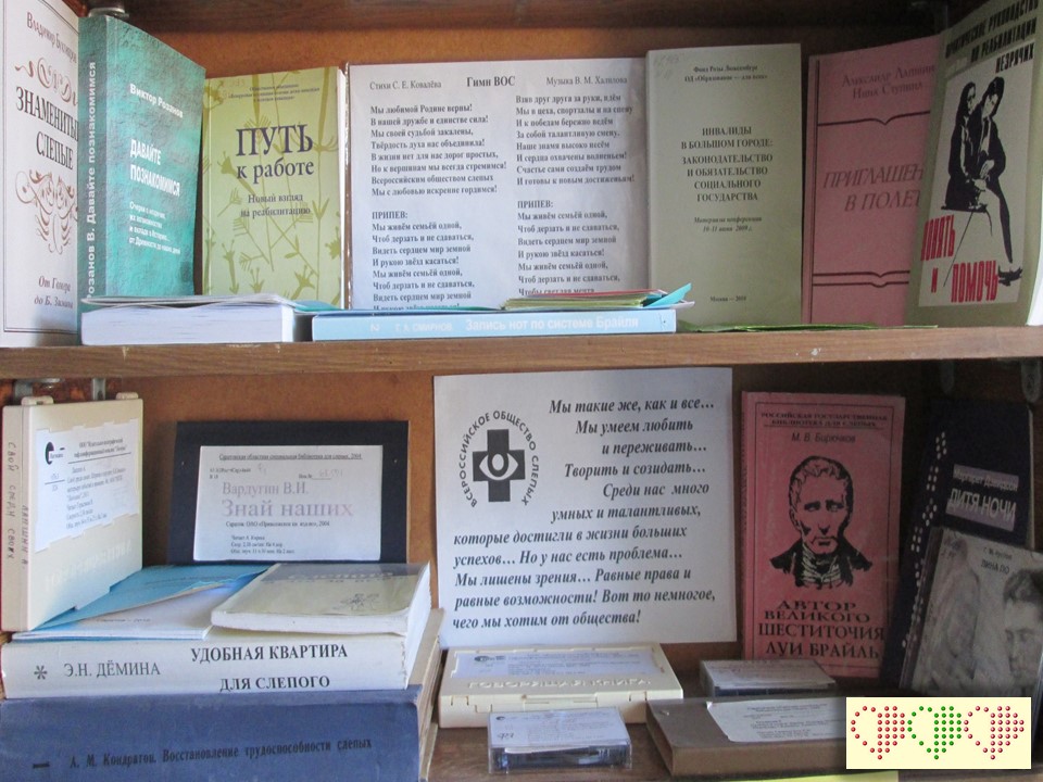 В Балаковском филиале Областной специальной библиотеки для слепых работает выставка-информация «Волшебные точки Брайля», рассказывающая о возникновении Международного дня слепых, об основоположниках тифлопедагогики В. Гаюи и Л. Брайле. На ней представлена художественная и документальная литература на разных носителях и разных форматов о людях, имеющих нарушения зрения; книжные издания-самоучители; издания библиотеки, в том числе творческий альманах (произведения читателей Балаковского филиала) «Мир, в котором я живу …»; приспособления для письма и чтения по системе Брайля; тактильные книжки от Фонда «Иллюстрированные книжки для маленьких слепых детей» и книжки-игрушки, сделанные для библиотеки школьниками-волонтерами.