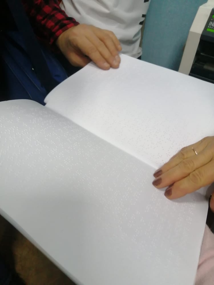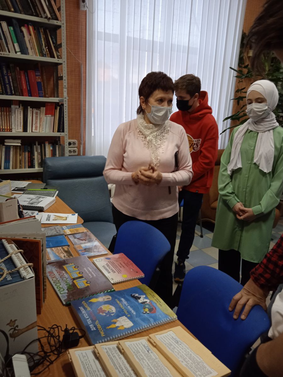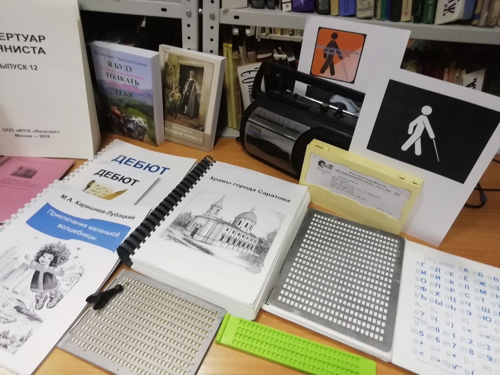 Для гостей проведён обзор выставки, где представлены книги в специальных форматах, а также прибор для письма с грифелем – начало всех начал, трость для слепых – главного помощника для передвижения.