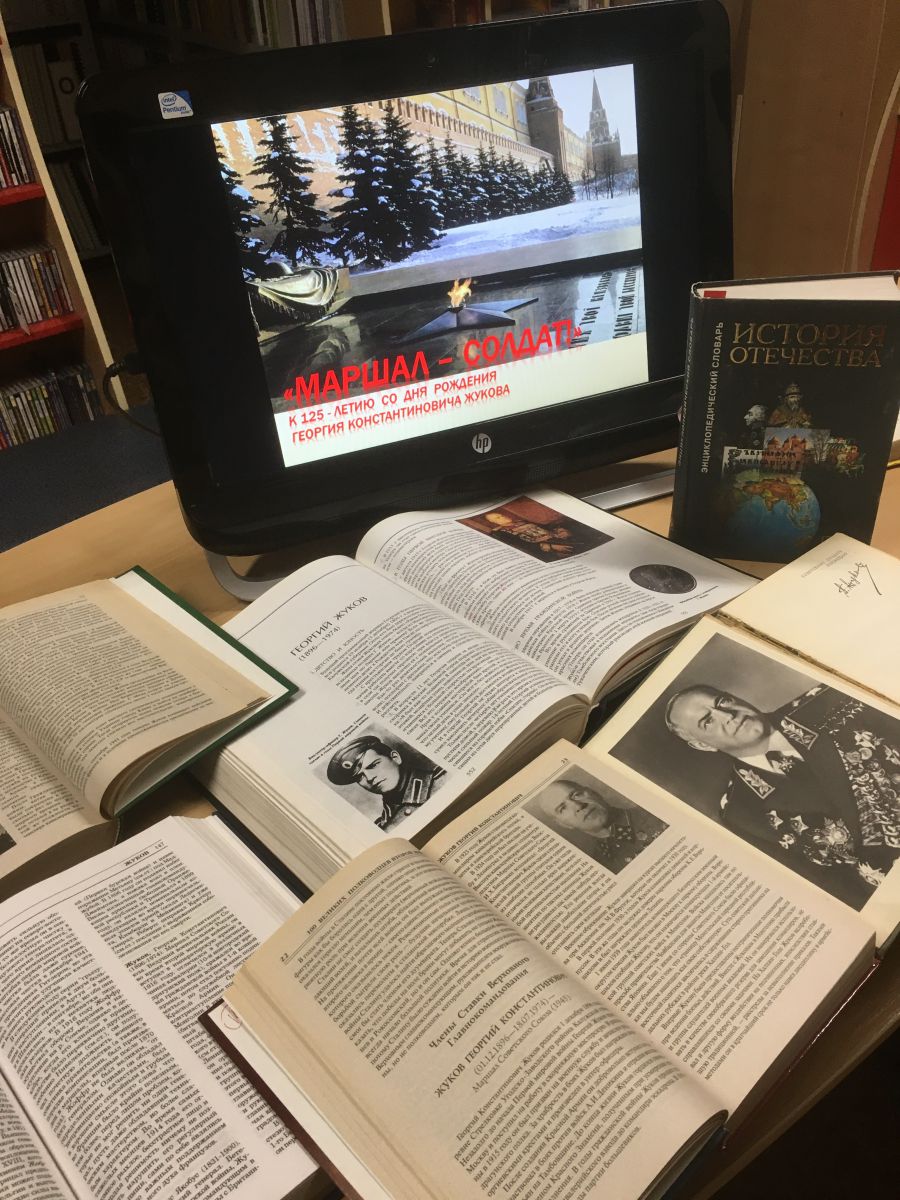 Ребят ждал рассказ о том, что сын простого сапожника, силой своего характера, жаждой знаний, старанием, смог стать великим полководцем. Речь шла о жизни и боевом пути Георгия Константиновича, были показаны множество снимков из его биографии, книги и выставочные материалы. Прозвучали стихи, кино- и видеоматериалы, высказывания, был рекомендован список литературы, в которой можно найти информацию о Г.К. Жукове.