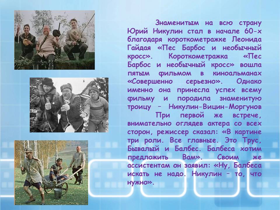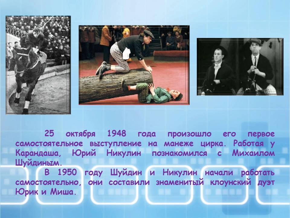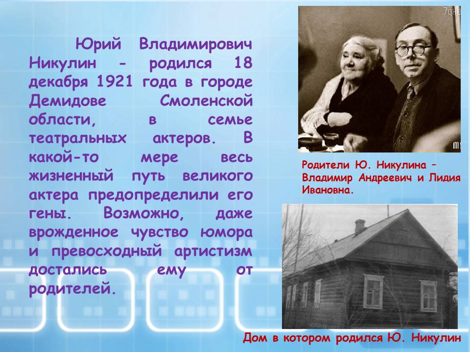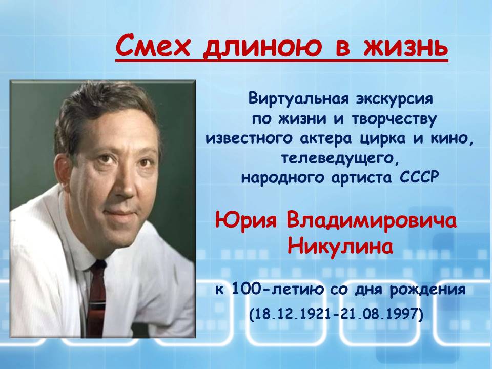 Уважаемые читатели! Приглашаем Вас посетить виртуальную экскурсию, посвященную вековому юбилею поистине народного артиста Юрия Владимировича Никулина. 18 декабря 2021 года исполняется 100 лет со дня его рождения. Роли, сыгранные Никулиным в кино и на арене цирка не только неизменно вызывают искренний смех, но и делают зрителей добрее, сердечнее, позитивнее. Вспомните Великого клоуна, узнайте о нем больше, улыбнитесь.