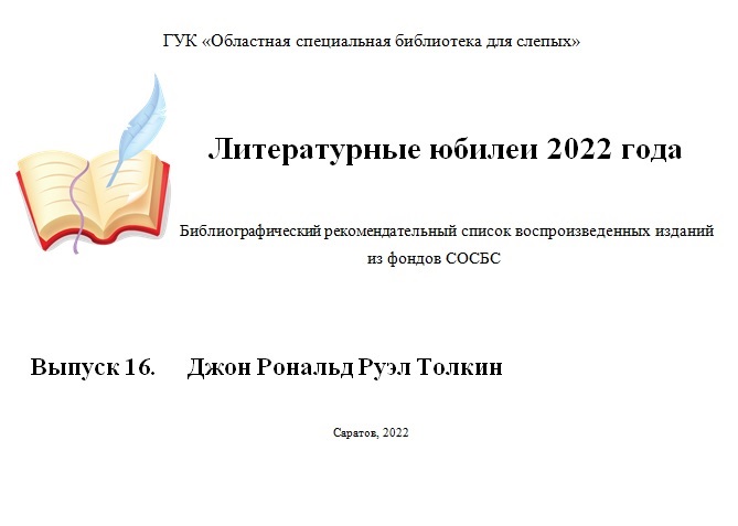 3 января исполняется 130 лет со дня рождения английского писателя Джона Рональда Руэла Толкина. Тифлобиблиографический отдел предлагает вашему вниманию библиографический рекомендательный список воспроизведенных изданий из фондов ГУК «Областная специальная библиотека для слепых» - «Литературные юбилеи 2022 года. Джон Рональд Руэл Толкин», подготовленный к юбилею писателя. Ознакомиться со списком можно по ссылке ниже.