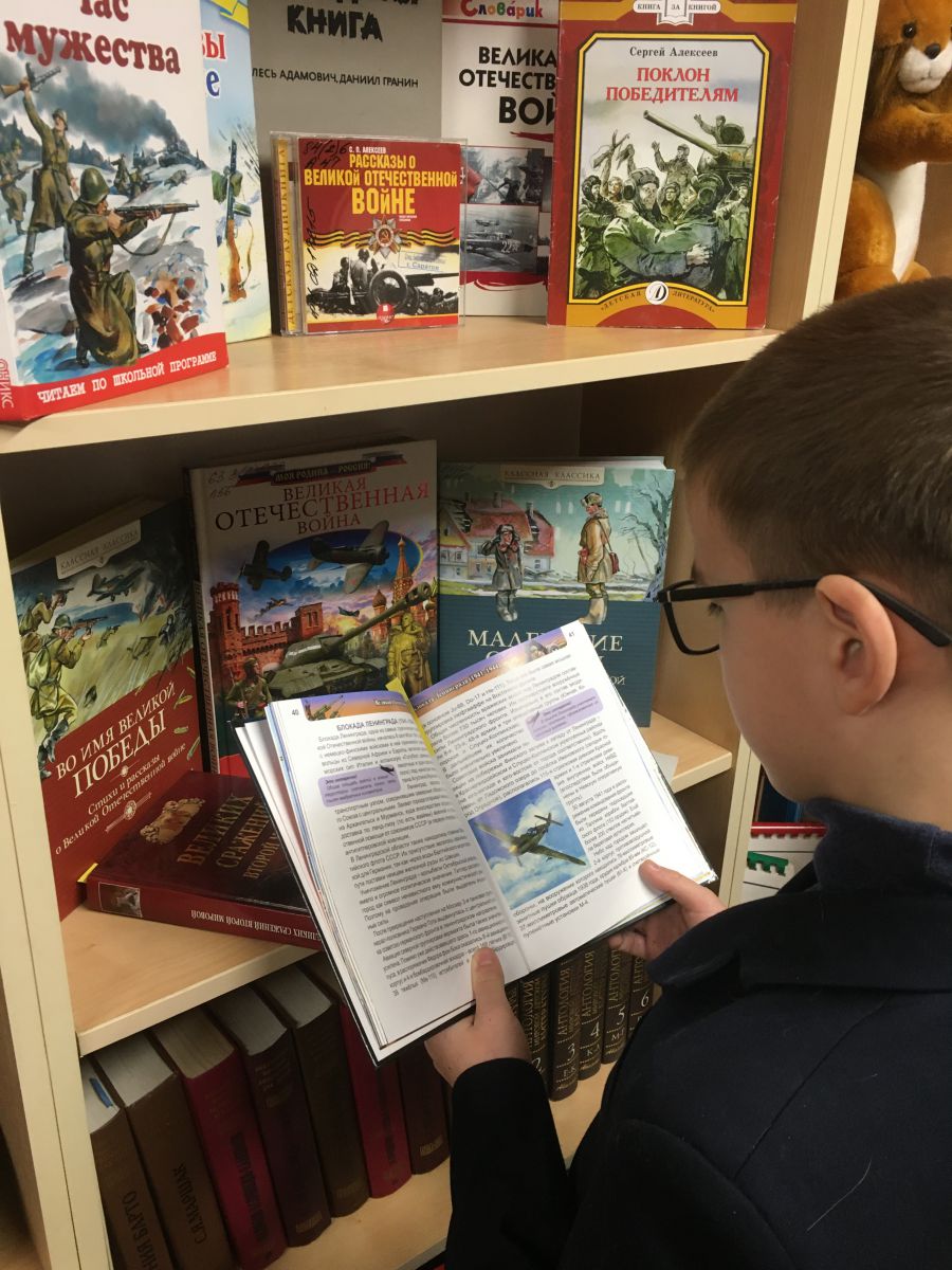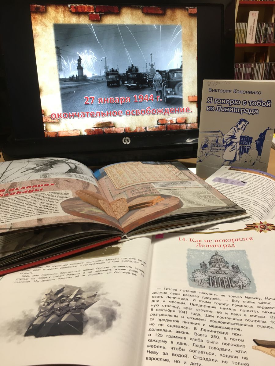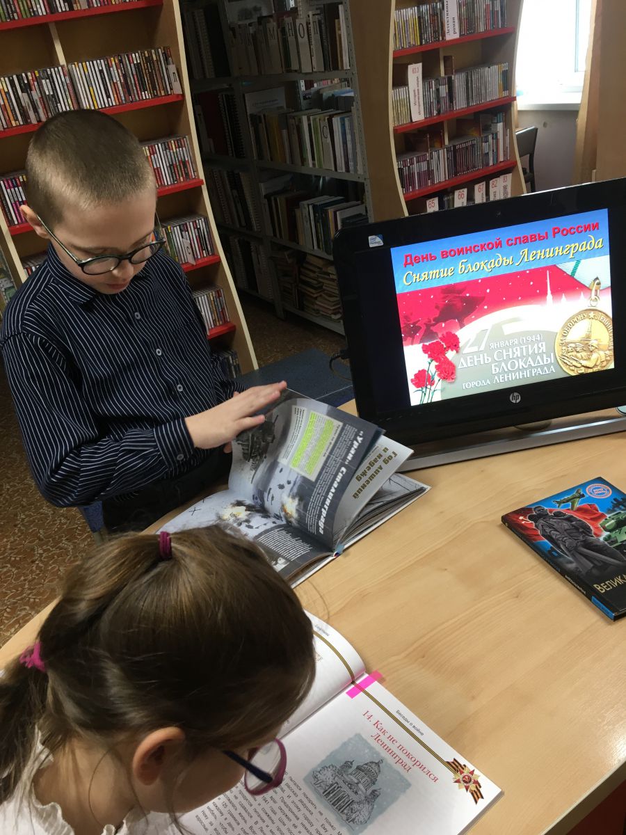 На электронных слайдах ребята увидели кадры военной кинохроники и послушали гимн войны. Подвигу защитников города на Неве посвящены многочисленные произведения литературы и искусства, начиная с созданных непосредственно в годы блокады 1941-1944 годов ее очевидцами и заканчивая произведениями современных авторов. Всех ребят очень заинтересовали материалы выставки, и книги были взяты для домашнего чтения.