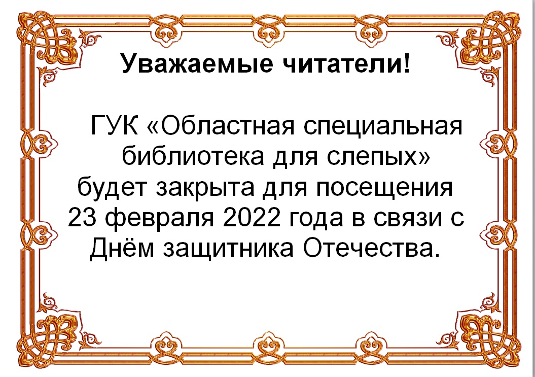 График работы ГУК «Областная специальная библиотека для слепых» 23 февраля 2022 года