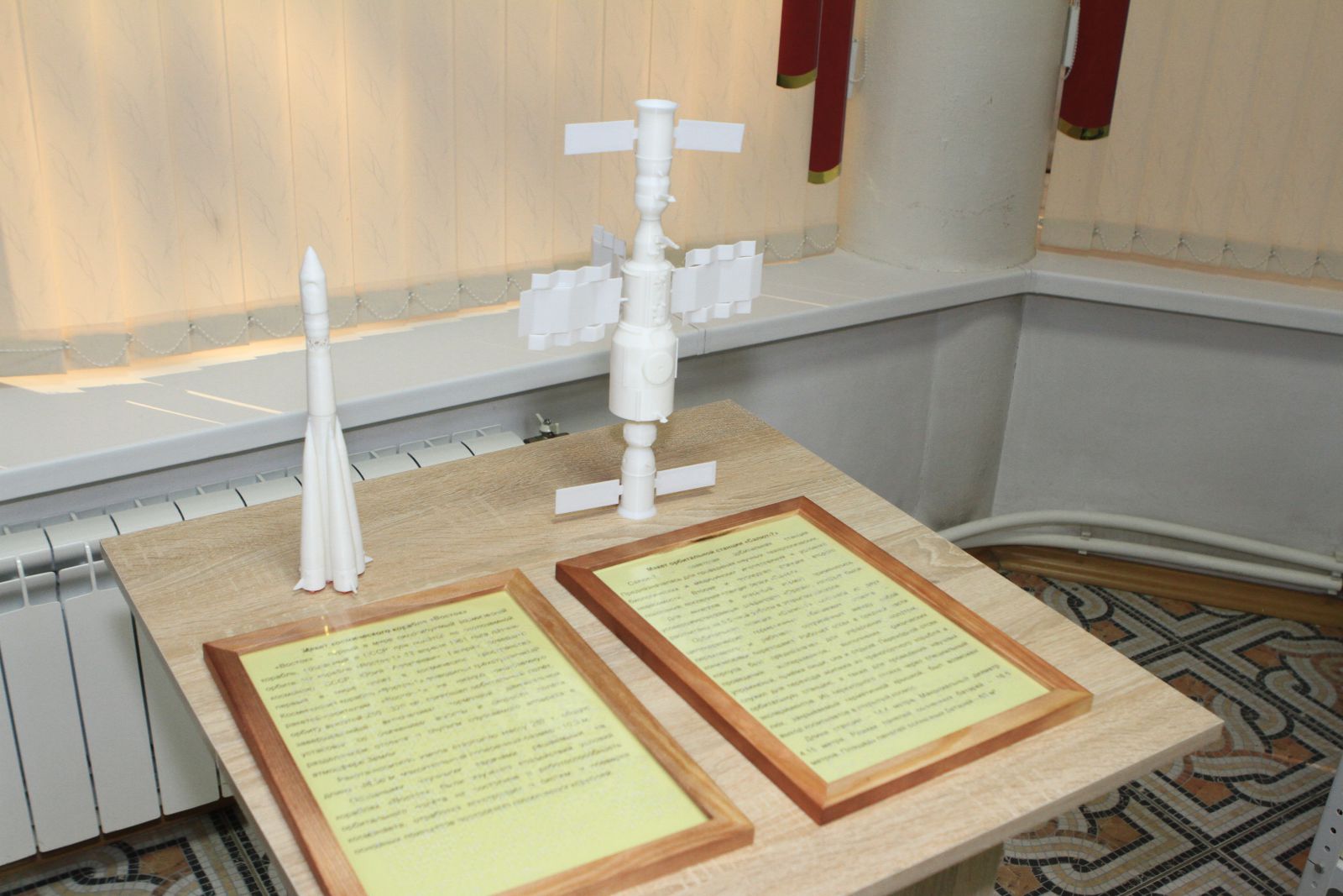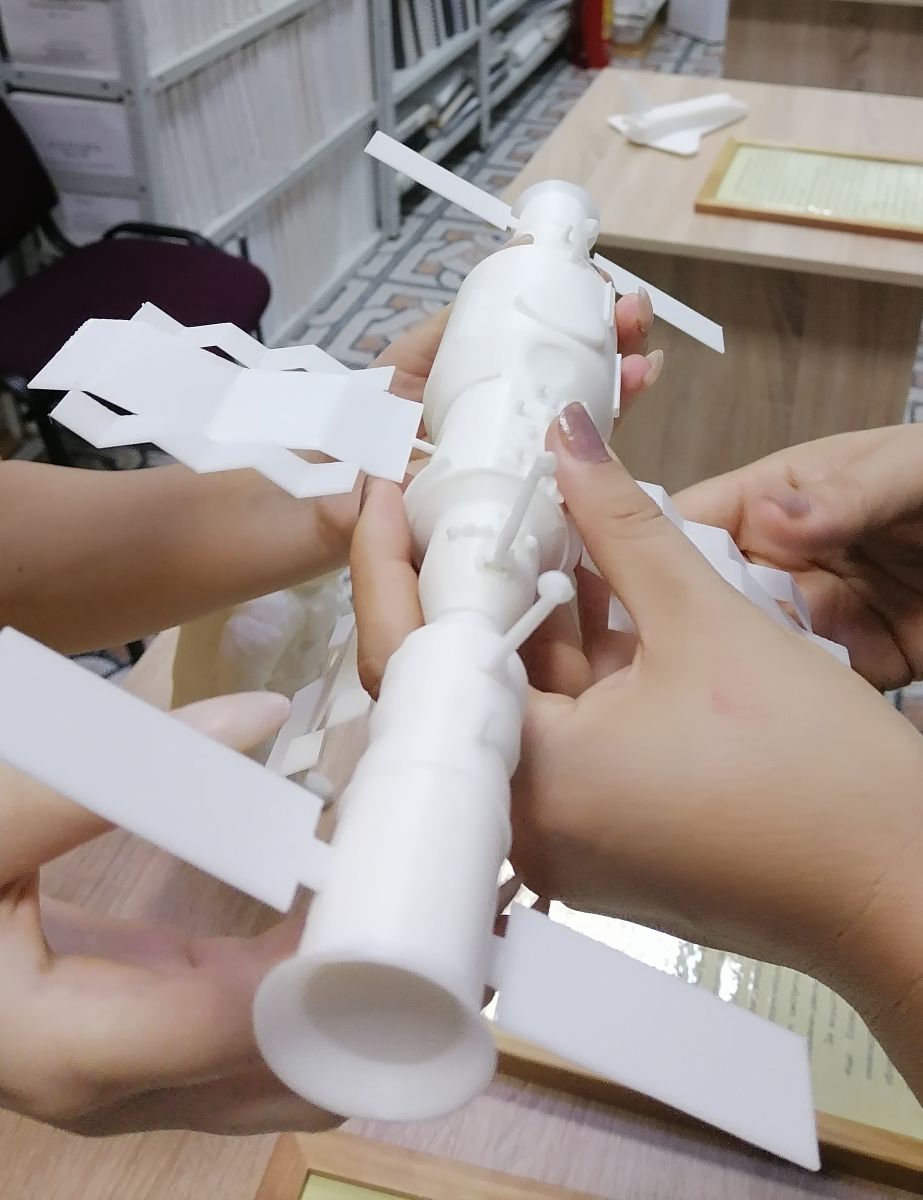 На выставке представлены тактильные макеты, связанные с космической тематикой, которые наши читатели могут «посмотреть» через прикосновения, осязания – тактильно: макеты космического корабля «Восток», космической станции «Салют-7», перового искусственного спутника Земли, спускаемого аппарата космического корабля «Восток», монументом, установленным на месте приземления Ю.А. Гагарина.