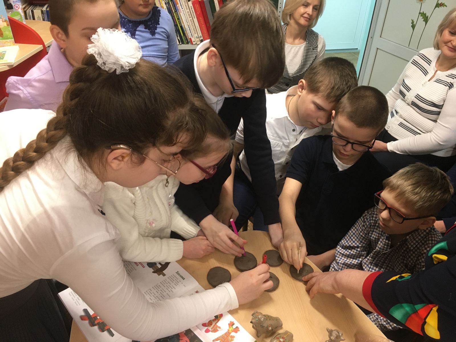 На нашей встрече присутствовала руководитель школьного творческого объединения «Веселая глина» Олева Е.Г., которое работает в направлении ямчатой глиняной игрушки. Она не просто рассказала ребятам про изготовление игрушек, но и показала как это происходит, каждый из присутствующих имел возможность попробовать свои силы в работе с глиной.