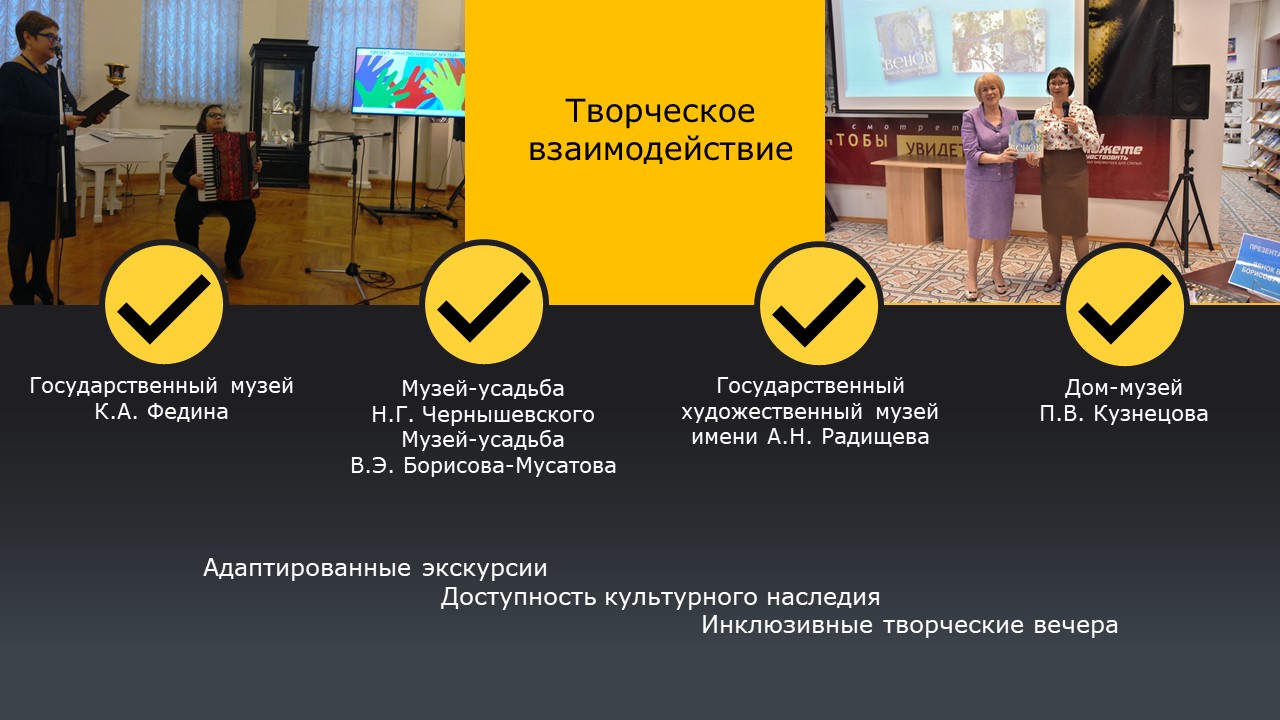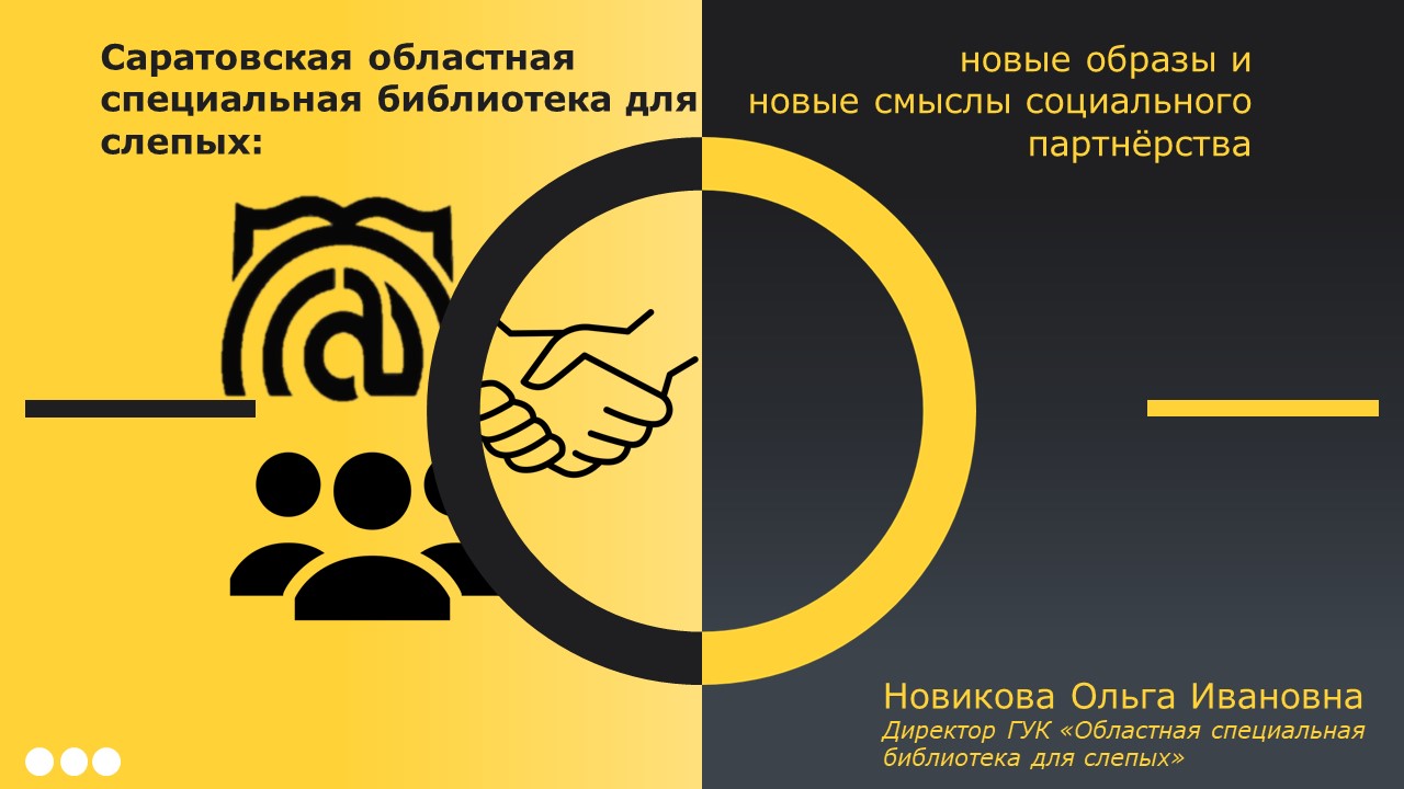 Благодаря умению выстраивать отношения с социальными партнёрами – культурными учреждениями, бизнес-структурами, органами власти и общественными организациями, волонтёрским движением – специальная библиотека становится многофункциональным центром, местом интеллектуального диалога, продвижения традиций, смыслов и брендов Саратовского региона, формирования цифровых навыков граждан с ограничениями зрения. Системная работа в данном направлении даёт огромный эффект деятельности библиотеки.