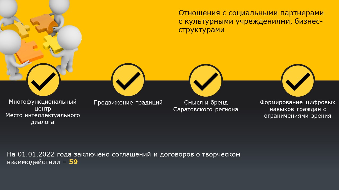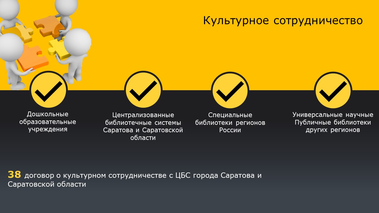 Расширение границ информационно-библиотечных услуг и привлечение к творческой самореализации жителей Саратова и области с инвалидностью по зрению невозможно без взаимодействия с дошкольными образовательными, учреждениями ЦБС г. Саратова, муниципальными библиотеками Саратовской области, областными библиотеками. Заключены 38 договоров о культурном сотрудничестве.