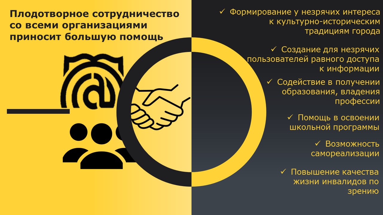 Социальное партнёрство позволяет увеличить перечень услуг, предоставляемых пользователям, поэтому наша библиотека постоянно стремится к расширению полезных деловых контактов и способствует улучшению качества жизни людей с ОВЗ.