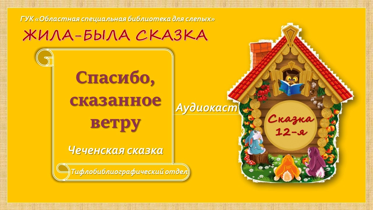 Предлагаем вашему вниманию двенадцатый выпуск аудиокаста «Жила-была сказка» к Году культурного наследия народов России. Аудиокаст подготовлен сотрудниками Тифлобиблиографического отдела Областной специальной библиотеки для слепых.