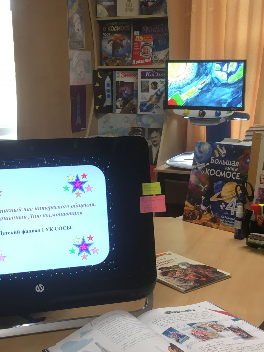 В ходе мероприятия был представлен красочно-познавательный видеоролик о космосе. Были прочитаны стихи о космосе и первом космонавте, разгаданы все космические загадки.