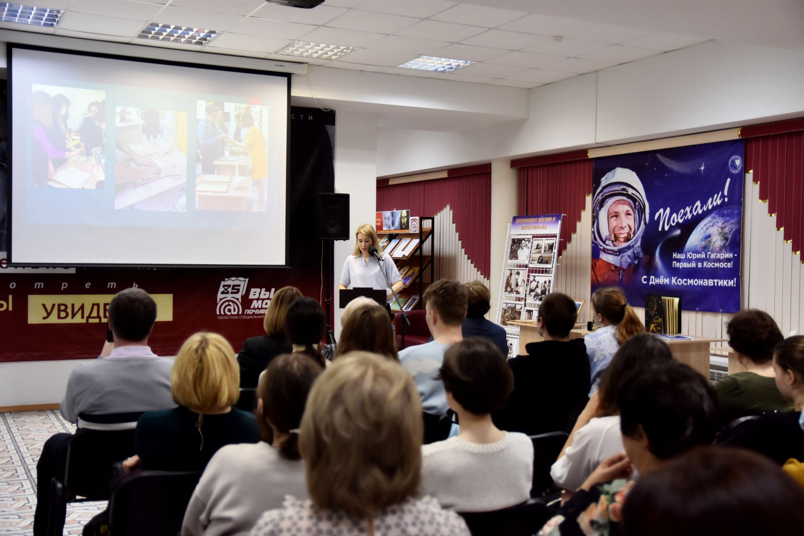 Впервые в Гагаринских чтениях приняла участие Смоленская областная специальная библиотека для слепых. Сотрудник библиотеки Татьяна Марченкова провела презентацию информационно-методических материалов ко Дню космонавтики, выпущенных библиотекой.
