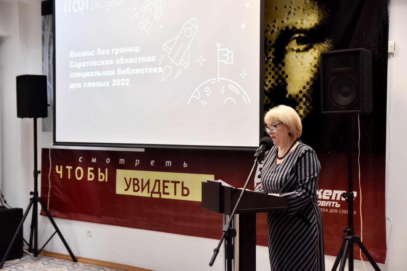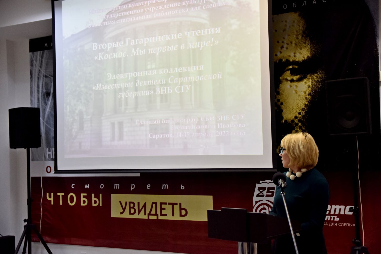 Работа Гагаринских чтений началась с доклада директора Областной специальной библиотеки для слепых Ольги Новиковой «Космос без границ: Саратовская областная специальная библиотека для слепых 2022». Доклад директора дополнили сотрудники библиотеки современным форматом – трейлером, посвящённым Вторым Гагаринским чтениям.