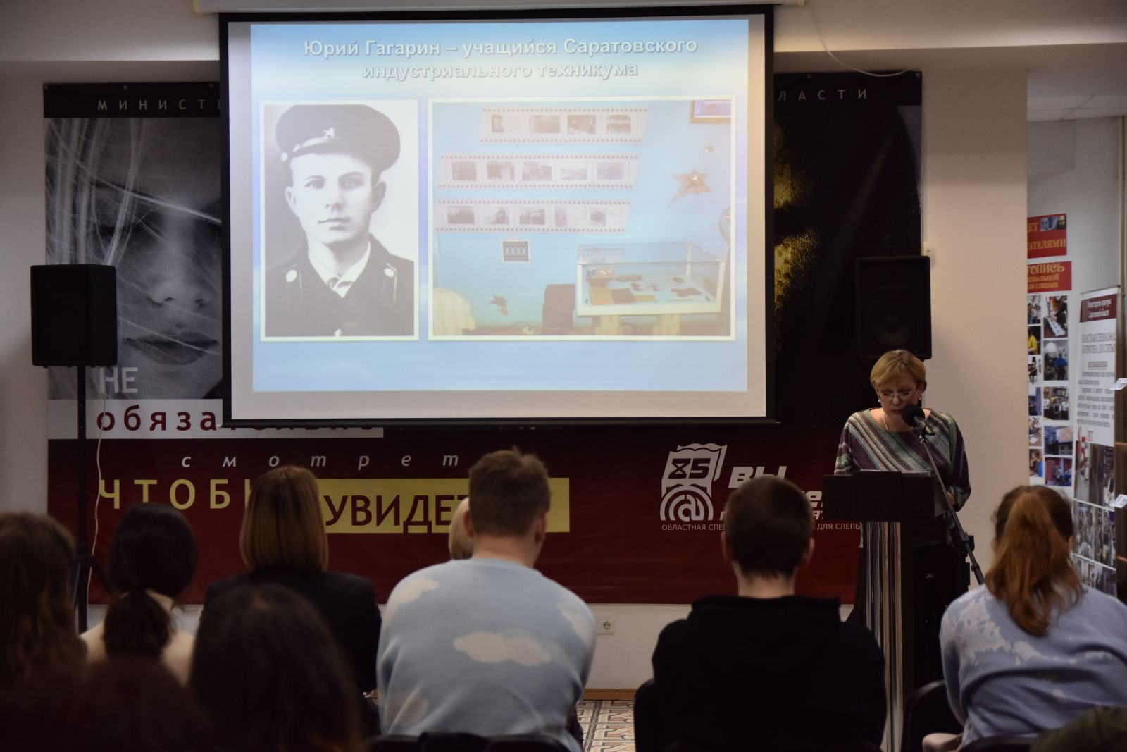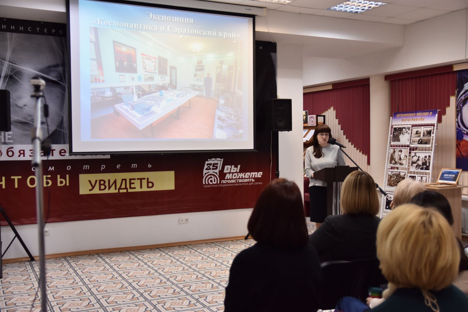 Необыкновенно творческой была презентация альбома «Гагарин – Саратов – Космос», которую провела Нина Грудзинская, сотрудник отдела издательских и медиатехнологий Областной специальной библиотеки для слепых.