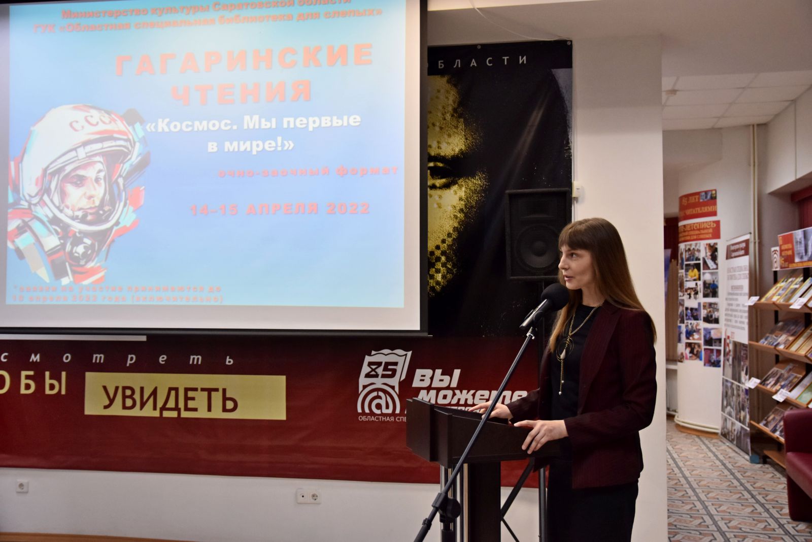 Торжественно и тепло ведущий предоставил слово для приветствия директору ГУК «Областная специальная библиотека для слепых» Ольге Новиковой, которая поприветствовала всех от имени министра культуры Саратовской области Наталии Юрьевны Щелкановой и пожелала всем, отправившимся в Гагаринские чтения, удачного старта.