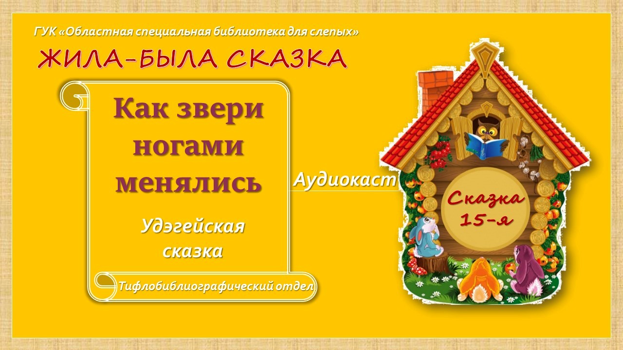 Предлагаем вашему вниманию пятнадцатый выпуск аудиокаста «Жила-была сказка» к Году культурного наследия народов России. Аудиокаст подготовлен сотрудниками Тифлобиблиографического отдела Областной специальной библиотеки для слепых.