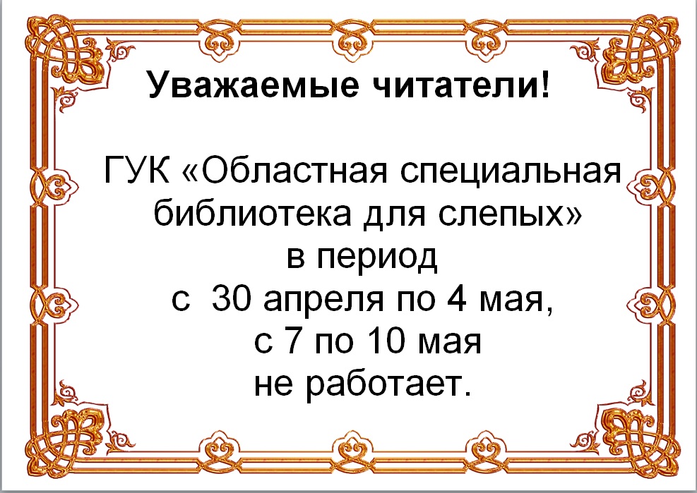 График работы ГУК «Областная специальная библиотека для слепых» в период майских праздников