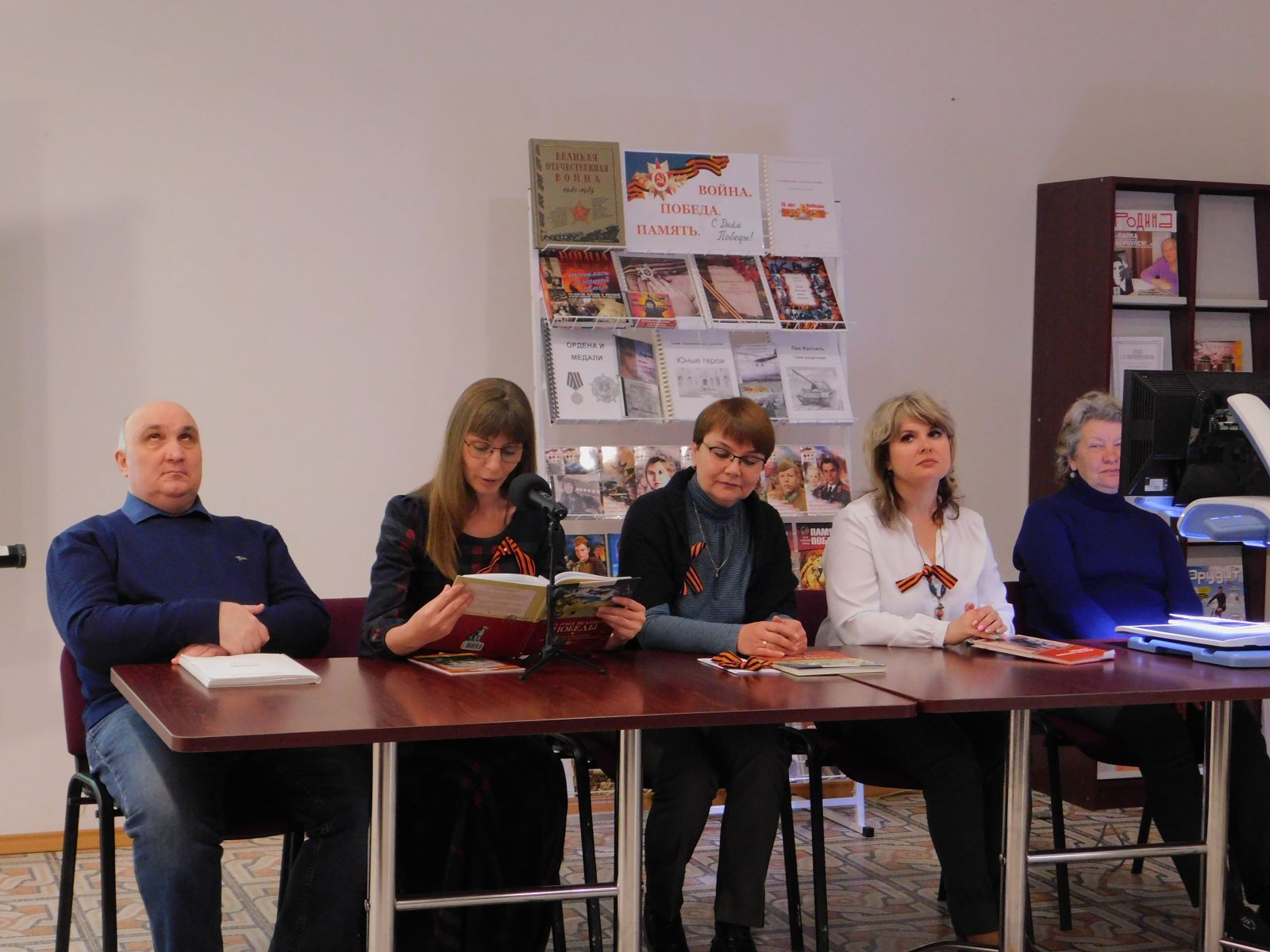 В зале была оформлена книжная выставка «Война. Победа. Память» ко Дню Победы. Ведущая мероприятия Марина Мартынова провела её краткий обзор.