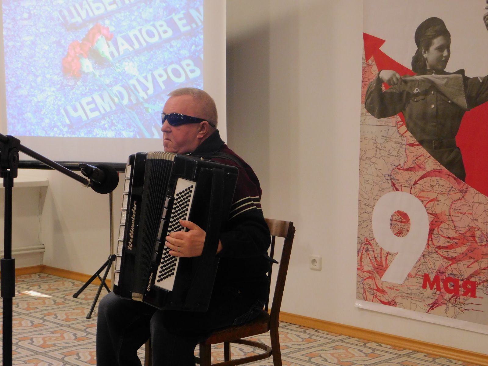 Аплодисментами был встречен музыкальный номер в исполнении Заслуженного работника культуры Российской Федерации Сергея Суменко «Синий платочек» в обработке незрячего баяниста Ивана Яковлевича Паницкого.