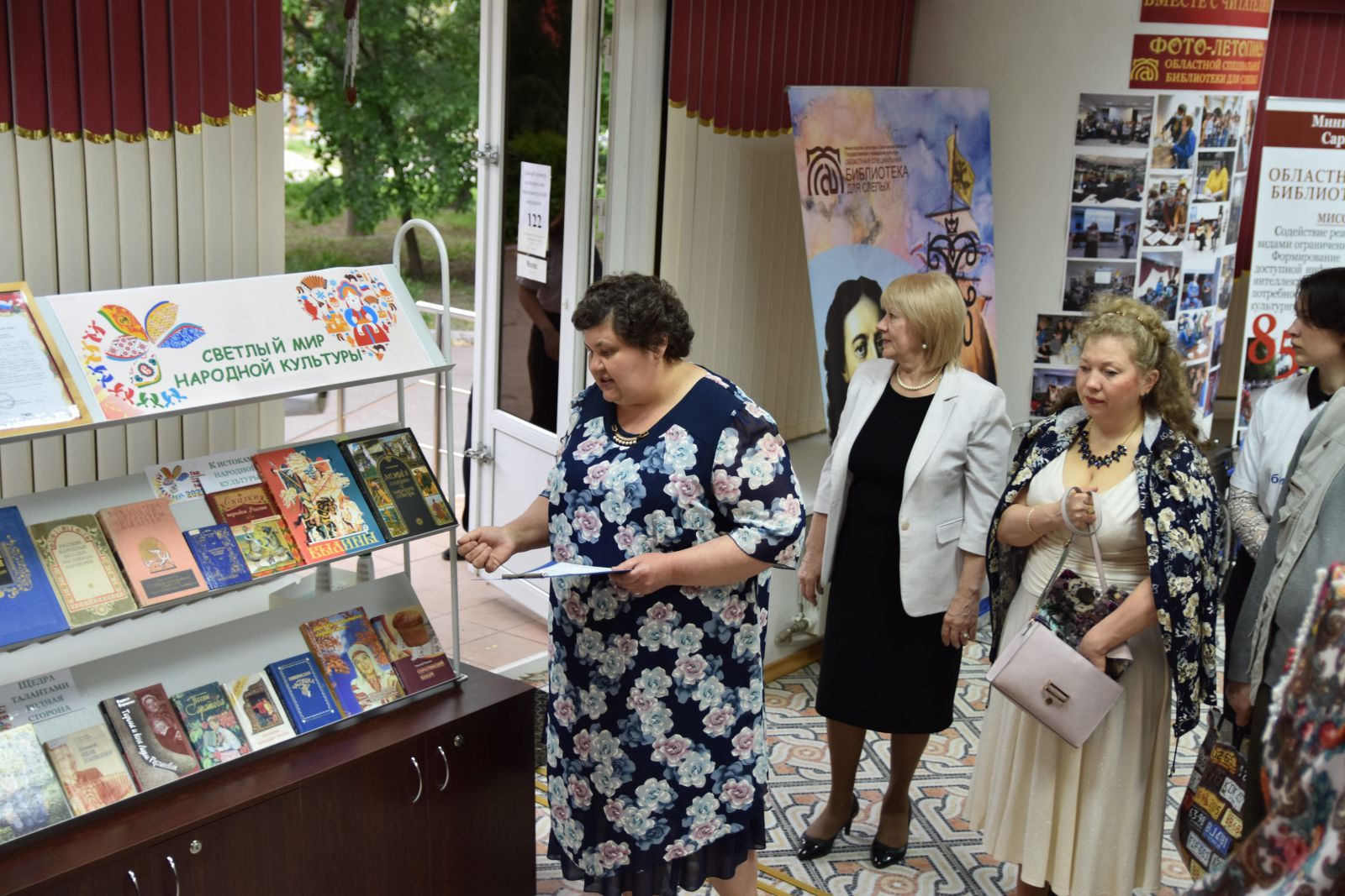 Мероприятие продолжилось в центре адаптивного чтения книжной выставкой, которую представила специалист библиотеки Марина Мартынова «Светлый мир народной культуры». Выставка состоит из нескольких разделов. Раздел, посвященный талантам нашего Саратовского края. Это исполнители русских народных произведений: Иван Паницкий, Лидия Русланова, Елена Сапогова. Особое место занимают издания о народной культуре и традиционном быте. Издания представлены как в специальных, так и в плоскопечатных форматах для проведения громкого чтения для незрячих читателей.